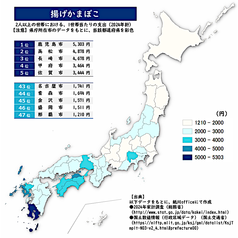 ‘ 正解は・・・ <揚げかまぼこ> 鹿児島市がトップ! さつま揚げ強いですね。 四国も色が濃い! 今日もたくさんのためになるリプをありがとうございます。 よい夜を! ★ファミマビジョンで出題中★ gate-one.co.jp/news/info/8326/ #揚げかまぼこ #地理 #GIS #クイズ #統計 pic.x.com/44uE4flfdR