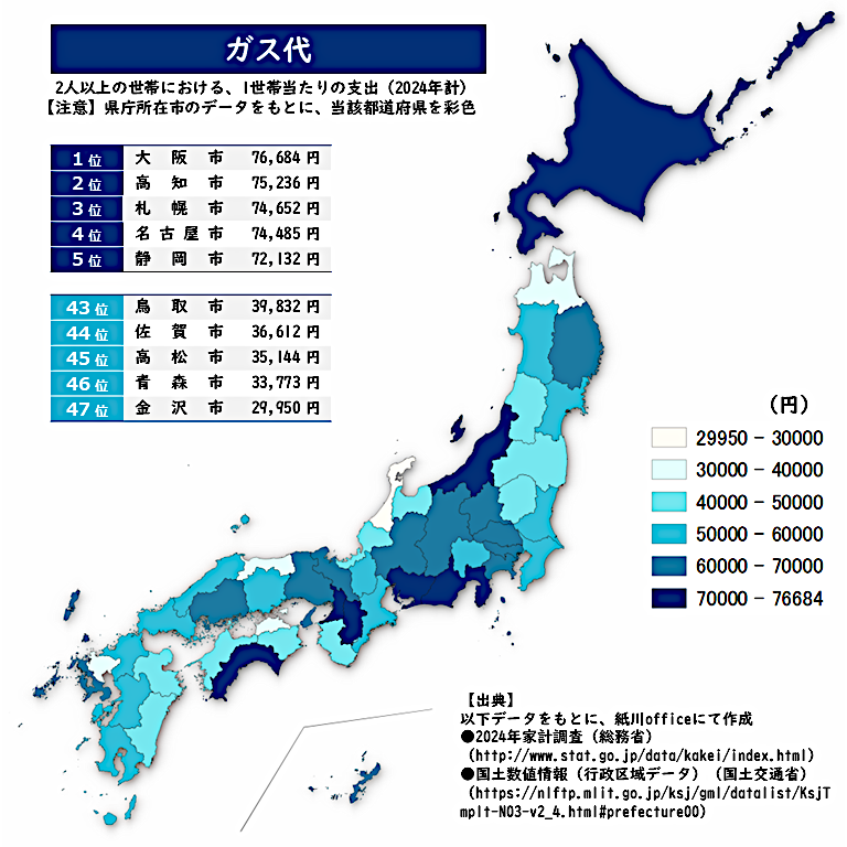 ‘ 正解は・・・ <ガス代> 大阪市がトップ! 都市ガスとプロパンガスが含まれます。 上下の差がかなり大きい。 今日もたくさんのためになるリプをありがとうございます。 おやすみなさい。 ★ファミマビジョンで出題中★ gate-one.co.jp/news/info/8326/ #ガス代 #地理 #GIS #クイズ #統計 pic.x.com/B6GT1bbPm8
