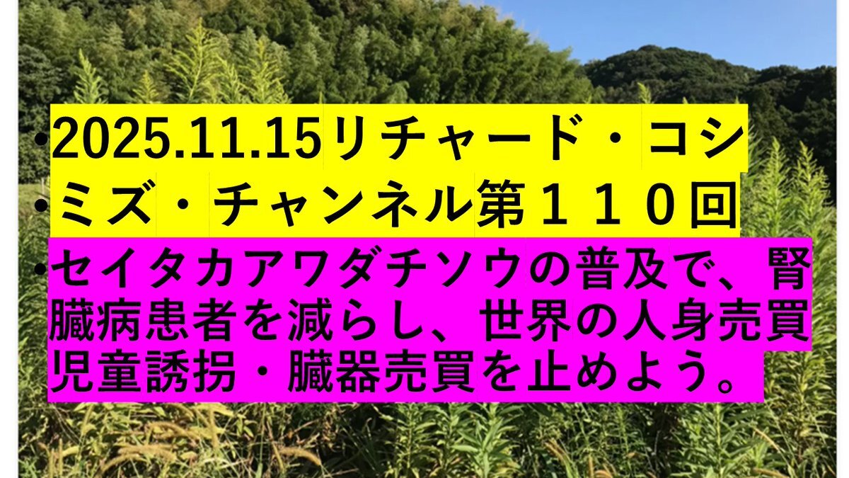 2025.11.15リチャード・コシミズ・チャンネル第110回 セイタカアワダチソウの普及で、腎臓病患者を減らし、世界の人身売買・児童誘拐・臓器売買を止めよう 本動画は、以下のサイトでご視聴いただけます。 live.nicovideo.jp/watch/lv349192… •#高市早苗 #統一教会 #日中戦争 #改憲 #緊急事態条項 #戒厳令 pic.x.com/brqT44Y7pu