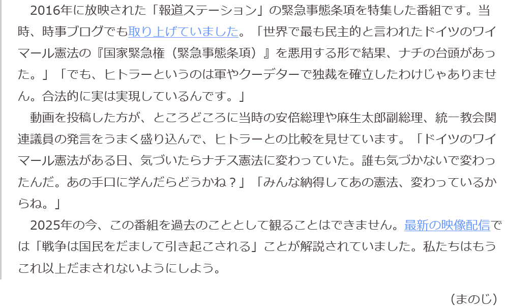 1 2016年放映の「報道ステーション」ドイツのワイマール憲法・国家緊急権の教訓を今一度 / ナチス憲法は合法的に誰にも気づかれずに確立していた shanti-phula.net/ja/social/blog… #ワイマール憲法 #ナチス憲法 #緊急事態条項 #緊急事態条項反対 pic.x.com/A60dwYtaDE