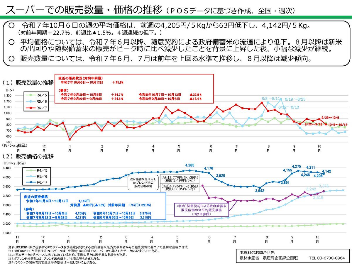 #米情報 スーパー等での米の販売価格の情報を更新。(10月6日~10月12日のデータ) 詳細は以下のリンクから確認できます。 maff.go.jp/j/syouan/keika…