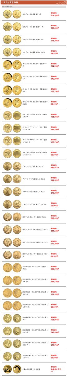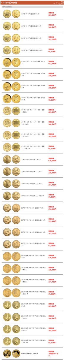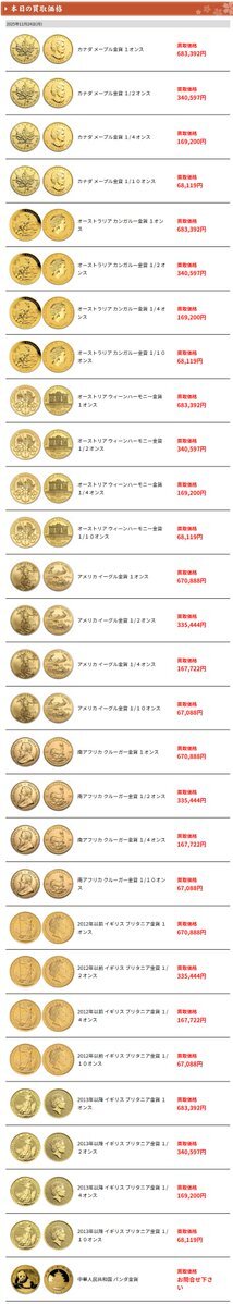 #メープル金貨 #クルーガー金貨 #金貨買取 本日の(2025年11月23日)店頭買取価格 メープル金貨 1oz 683,392円 1/2oz 340,597円 1/4oz 169,200円 1/10oz 68,119円 クルーガー金貨 1oz 670,888円 1/2oz 335,444円 1/4oz 167,722円 1/10oz 67,088円 ★手数料なし、お支払いの金額です pic.x.com/evf5ZG2RgQ