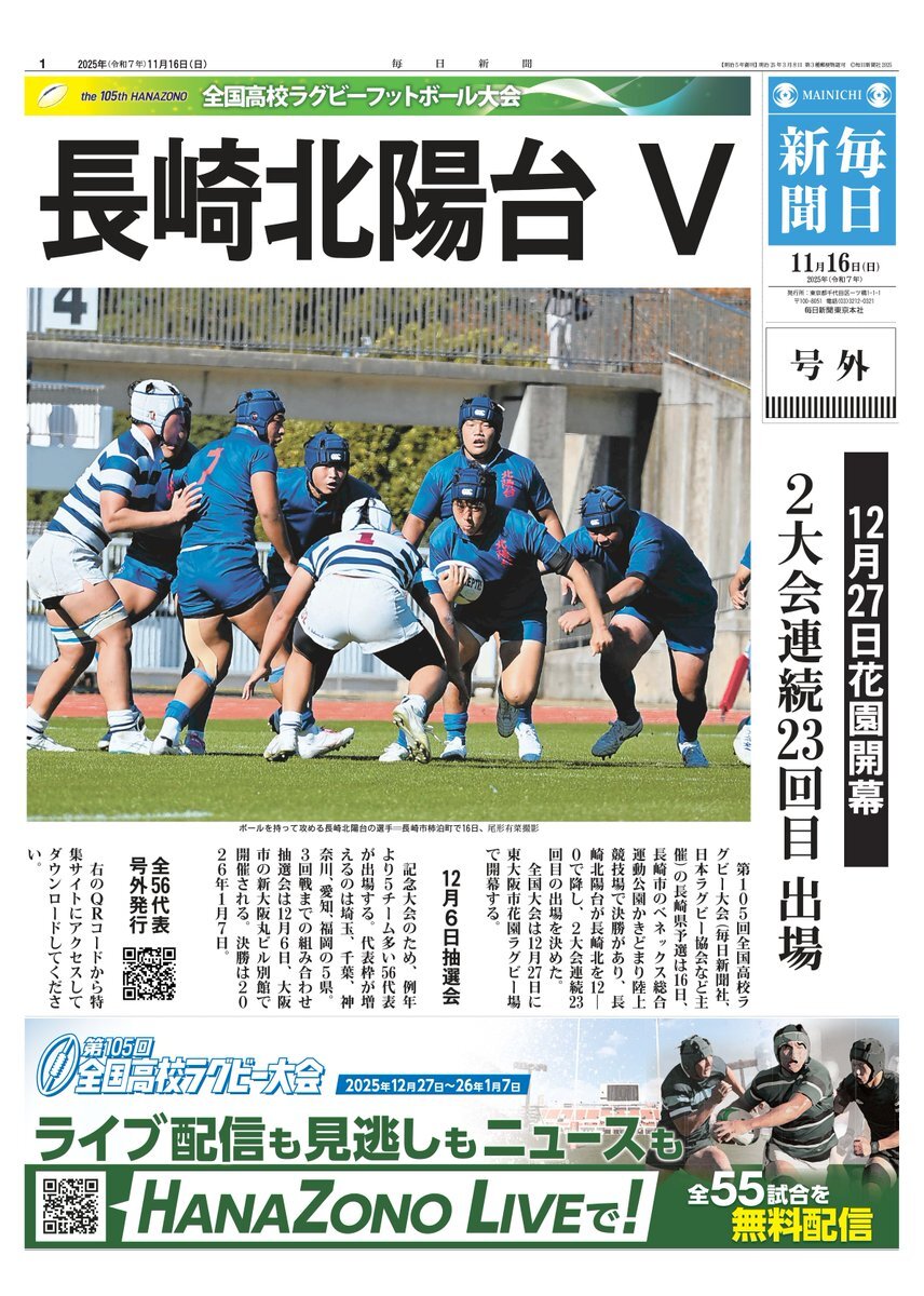 🏉#全国高校ラグビー 長崎予選🏉 / #長崎北陽台 が長崎北を降し、優勝🔥 2大会連続23回目の花園へ🌸 \ 号外のダウンロードはこちらから👇 各地区予選の決勝日程もチェックできます mainichi.jp/rugby-highscho… #ラグビー #長崎 #rugby pic.x.com/XFjEtIQqDX
