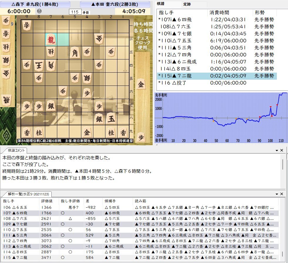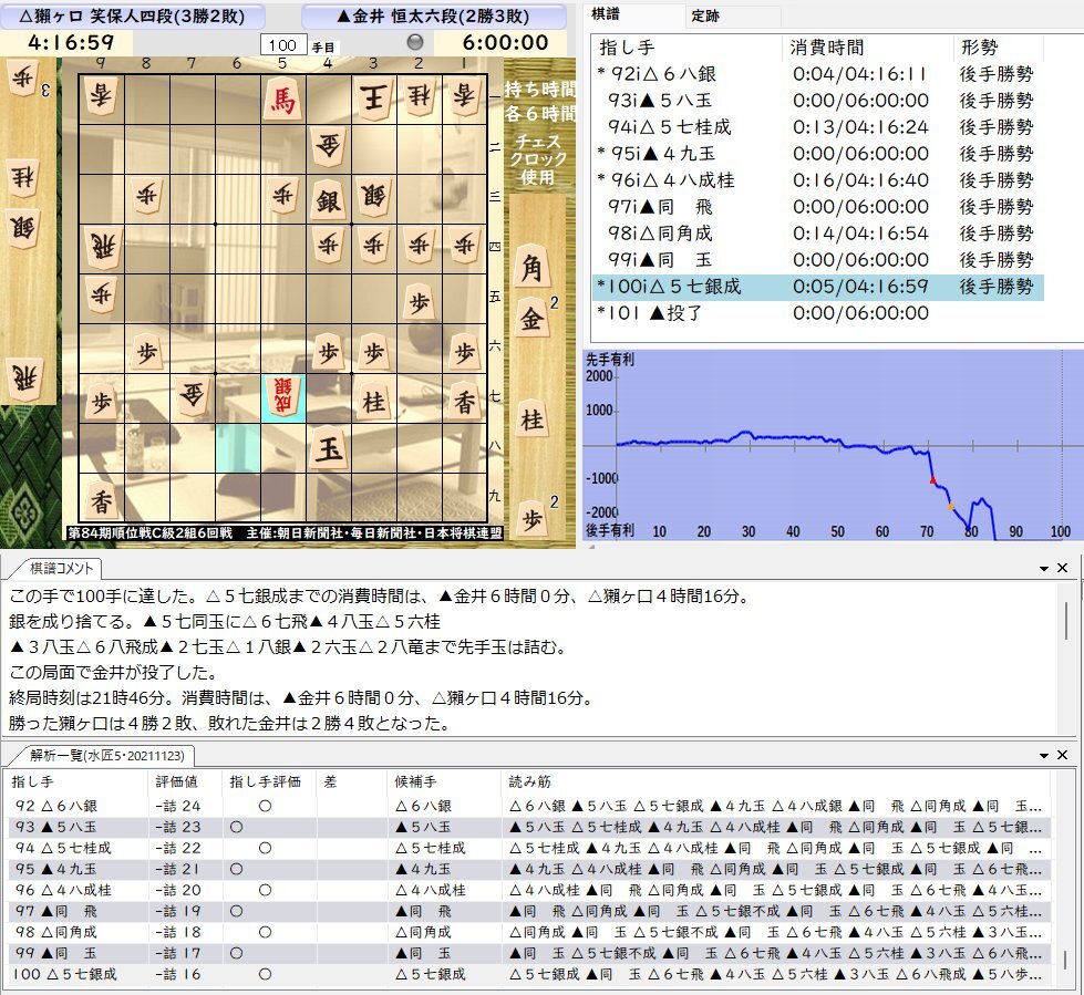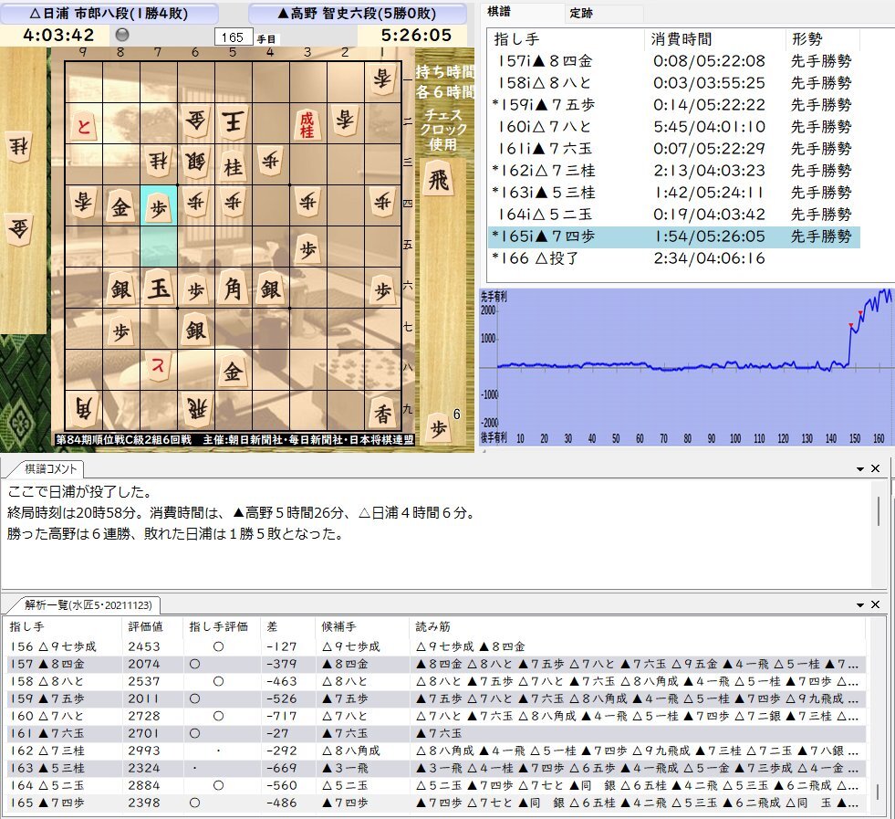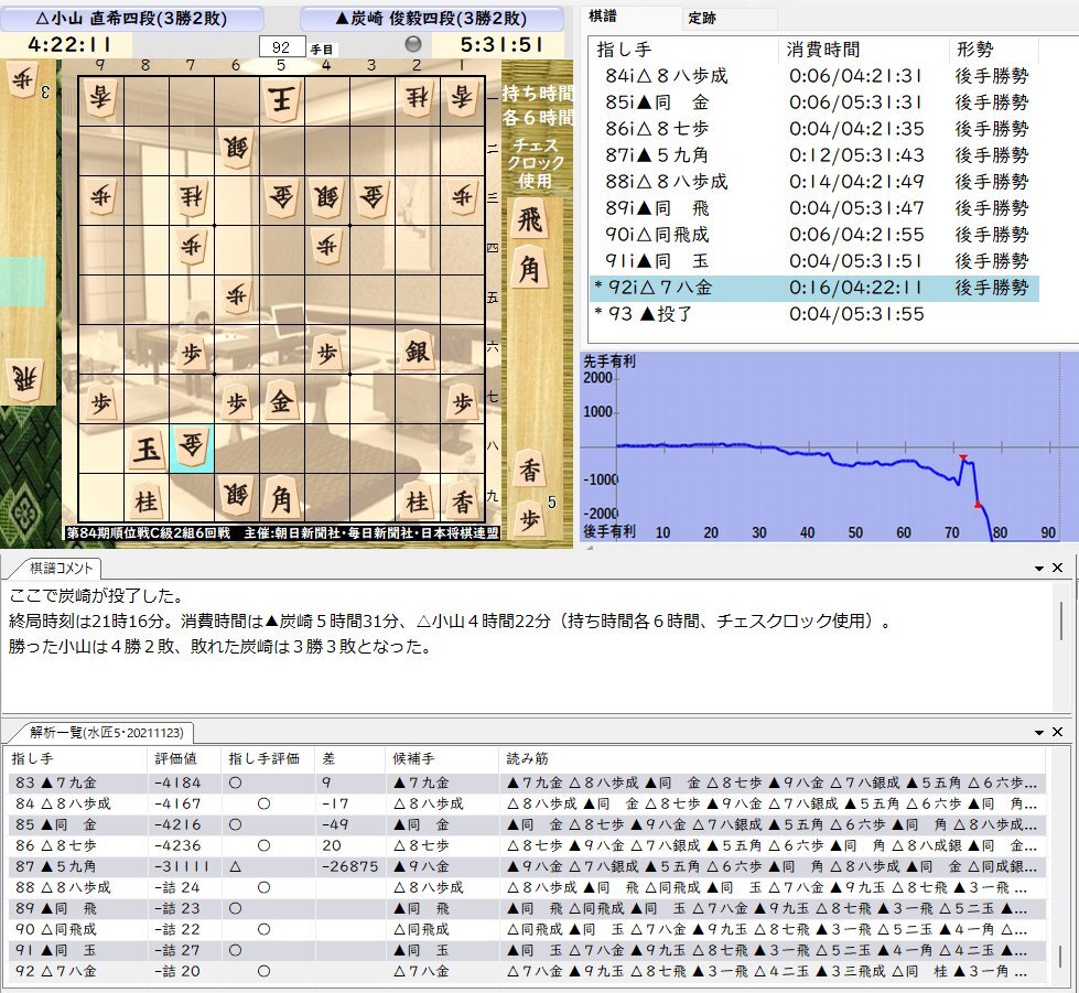 #順位戦 C2 6回戦(20:45~22時に終局) 勝▲高野智史六段(5-0) - 敗△日浦市郎八段(1-4) 20:58 165手 敗▲炭崎俊毅四段(3-2) - 勝△小山直希四段(3-2) 21:16 92手 勝▲本田 奎六段(2-3) - 敗△森下 卓九段(1-4) 21:29 115手 敗▲金井恒太六段(2-3) - 勝△獺ヶ口笑保人四段(3-2) 21:46 100手 pic.x.com/0xb77lU7AD
