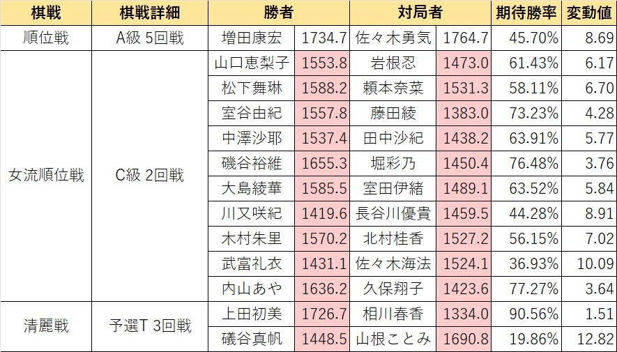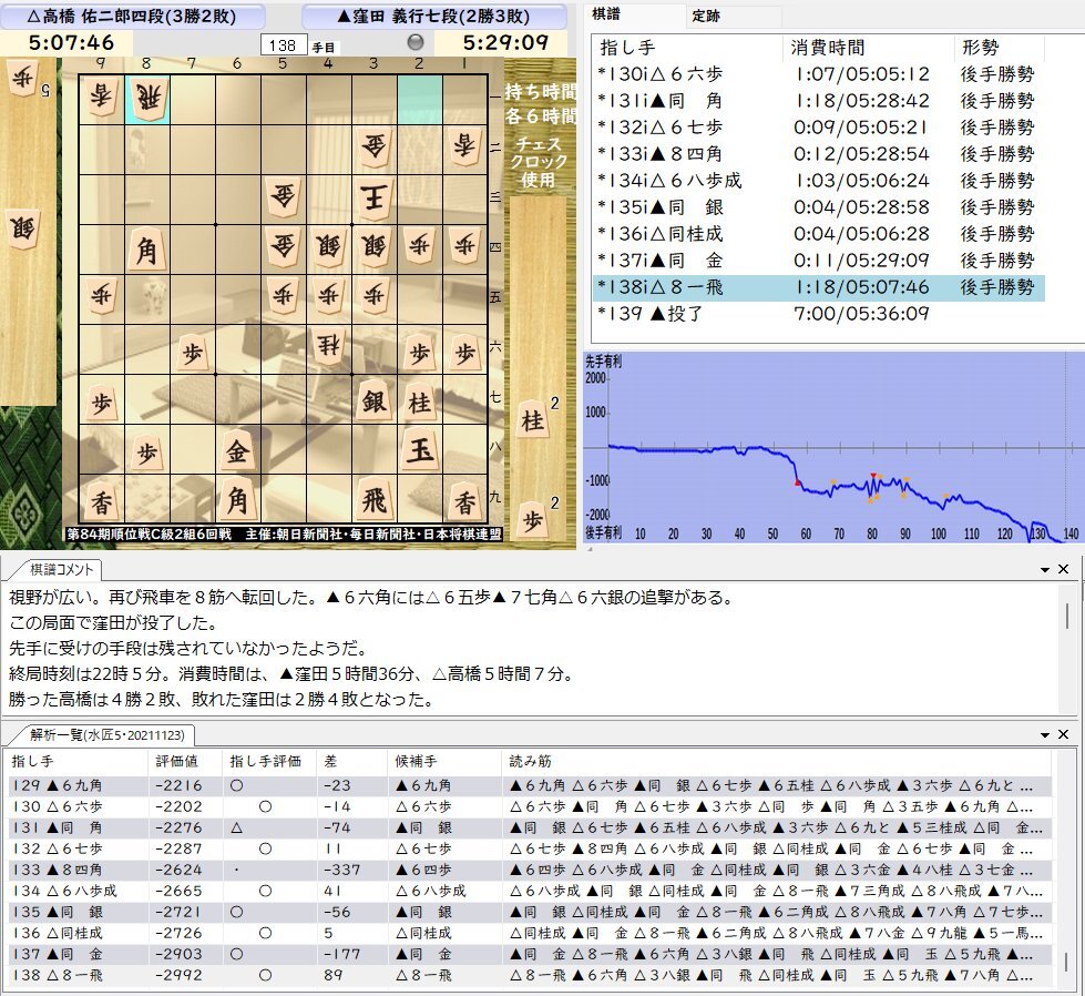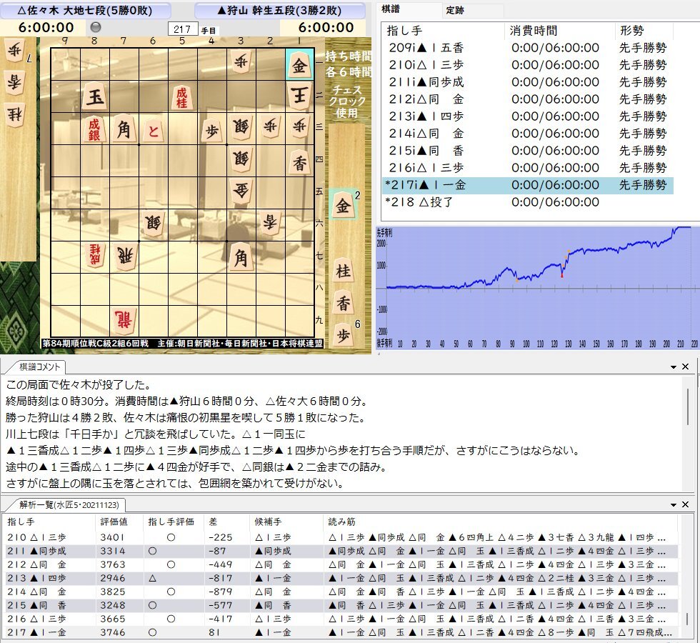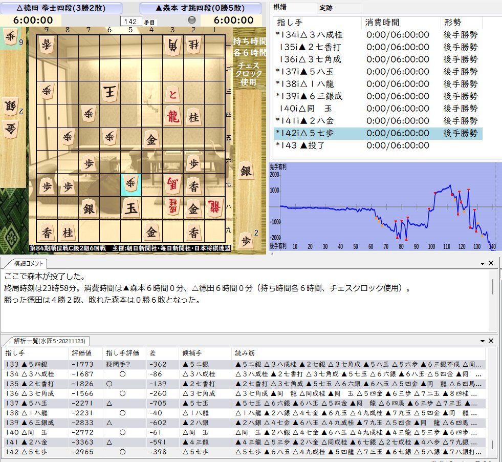 #順位戦 C2 6回戦(20:45~22時に終局) 勝▲高野智史六段(5-0) - 敗△日浦市郎八段(1-4) 20:58 165手 敗▲炭崎俊毅四段(3-2) - 勝△小山直希四段(3-2) 21:16 92手 勝▲本田 奎六段(2-3) - 敗△森下 卓九段(1-4) 21:29 115手 敗▲金井恒太六段(2-3) - 勝△獺ヶ口笑保人四段(3-2) 21:46 100手 pic.x.com/0xb77lU7AD