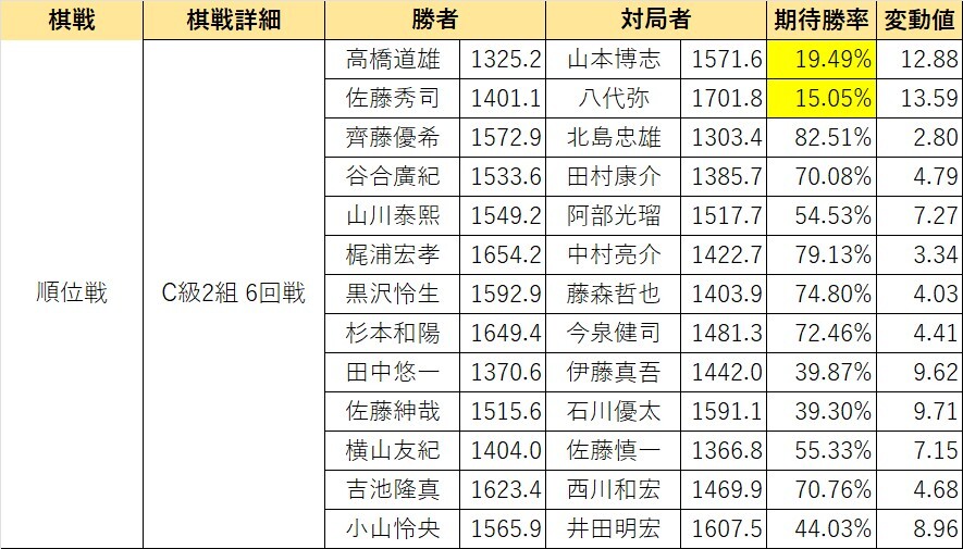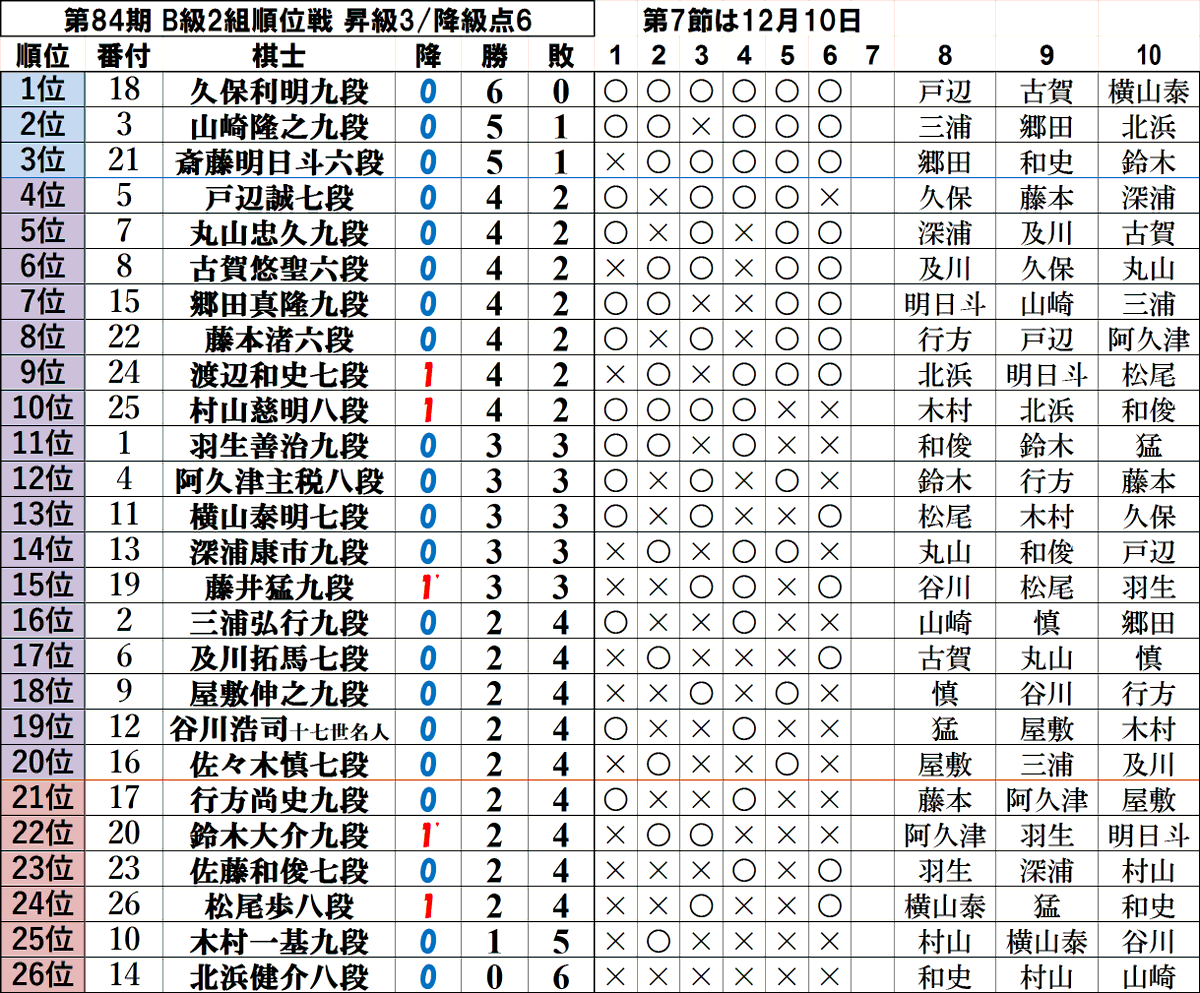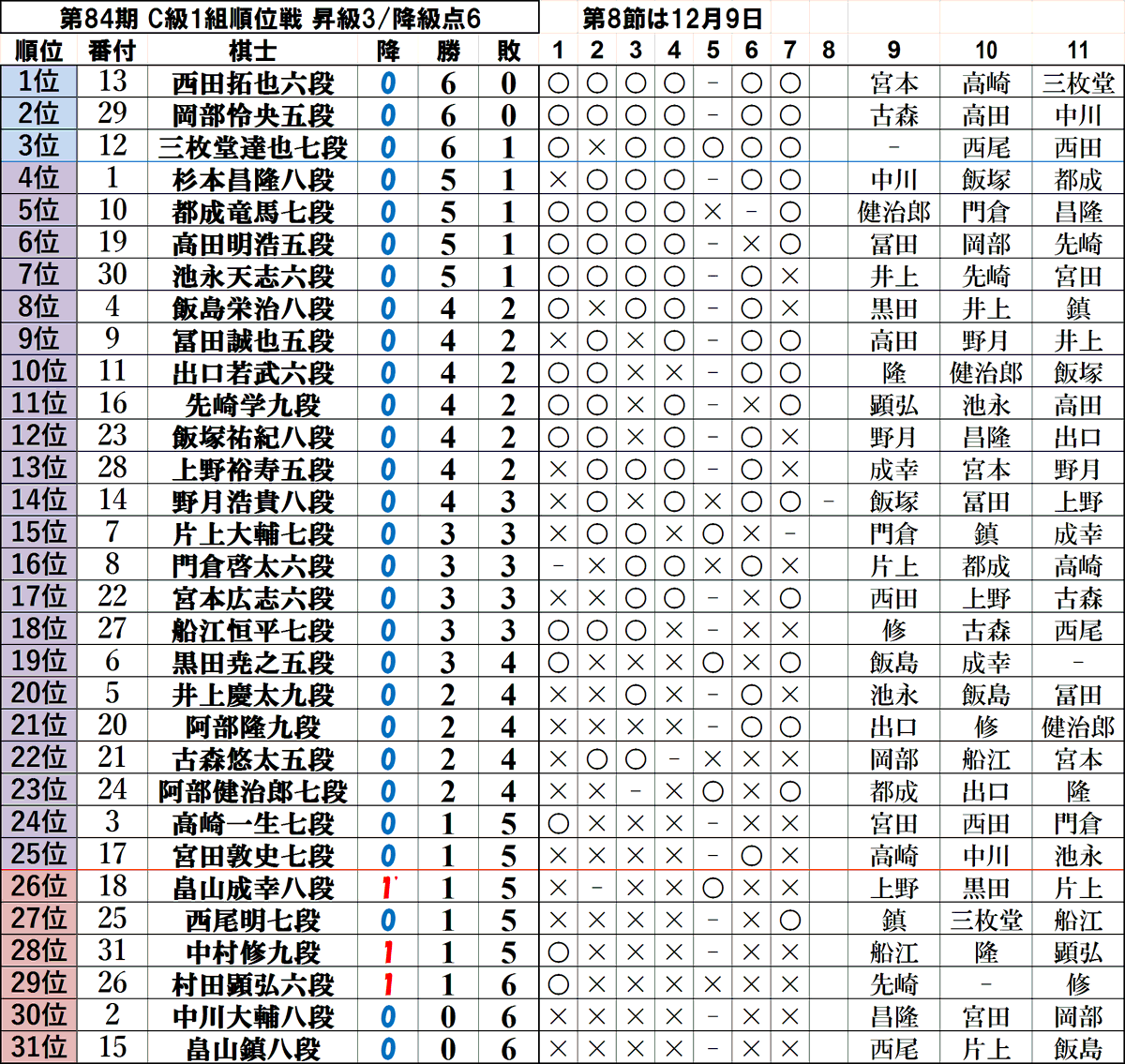 本日は #順位戦 C級2組 6回戦の 後半12局が行われます。 昇級確率トップ5の対局は以下の通りです。 八代-佐藤秀,黒沢-藤森,梶浦-中村亮 前半では2名が全勝をキープ。 現在全勝の八代八段、黒沢六段は 全勝を維持できるでしょうか。 x.com/shogilating/st…
