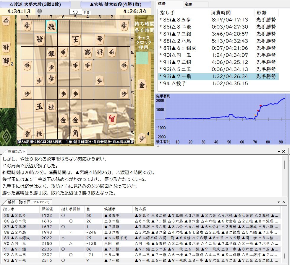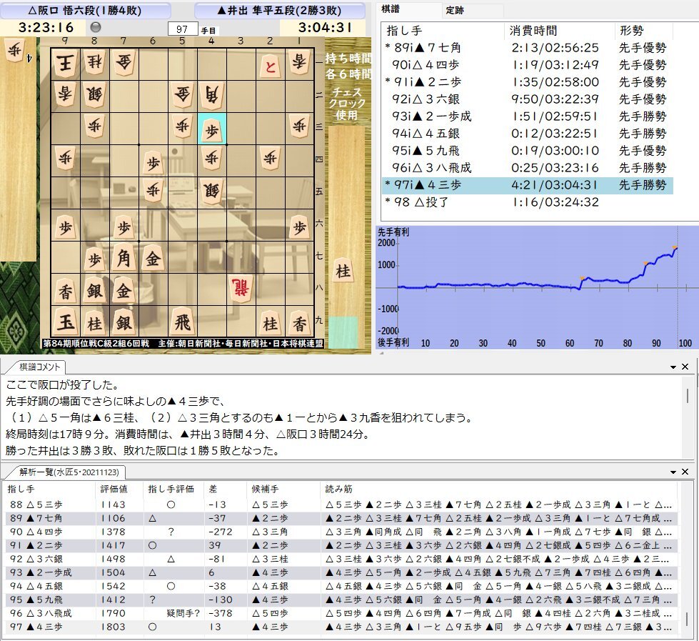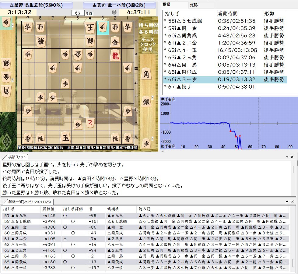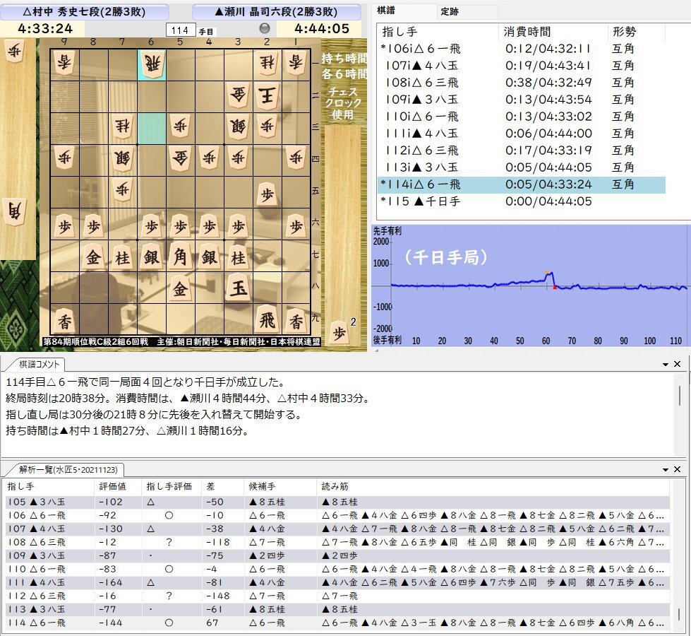 #順位戦 C2 6回戦(20:45迄に終局) 勝▲井出隼平五段(2-3) - 敗△阪口 悟六段(1-4) 17:09 97手 敗▲真田圭一八段(3-2) - 勝△星野良生五段(5-0) 19:12 66手 勝▲宮嶋健太四段(4-1) - 敗△渡辺大夢六段(3-2) 20:22 93手 千▲瀬川晶司六段(2-3) - 千△村中秀史七段(2-3) 20:38 114手 pic.x.com/swVksAv9nt