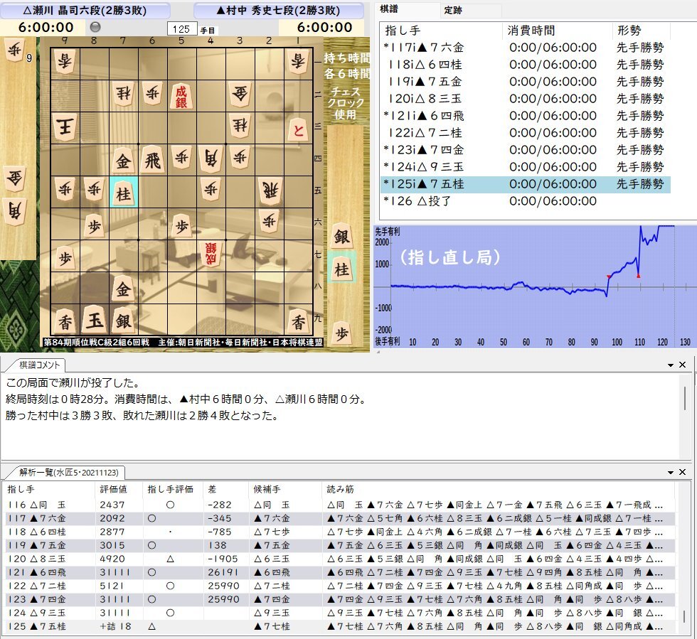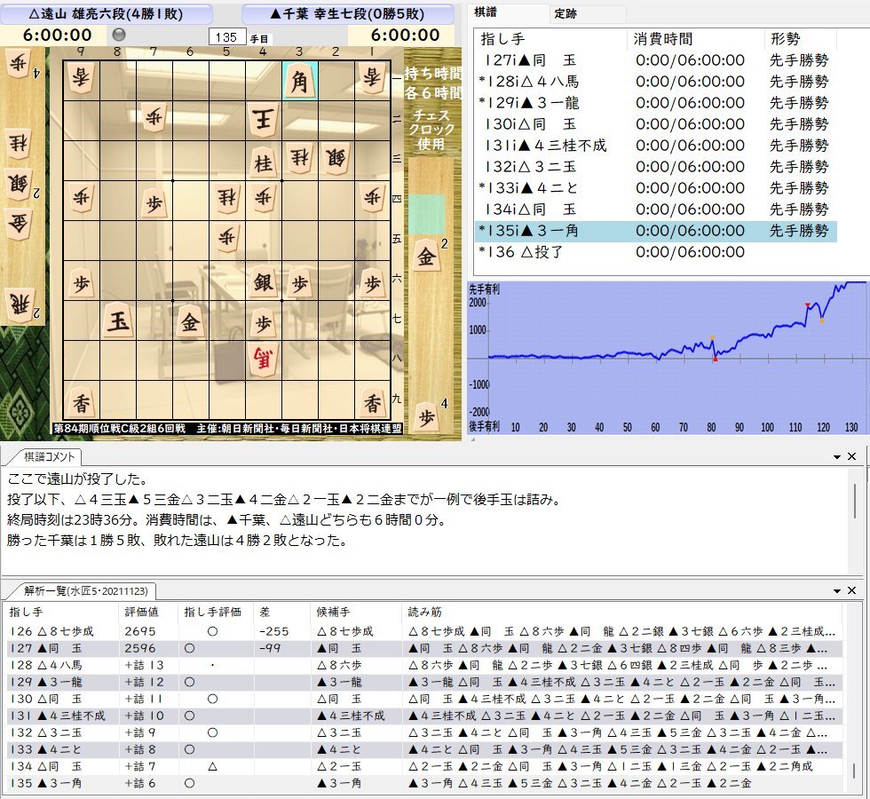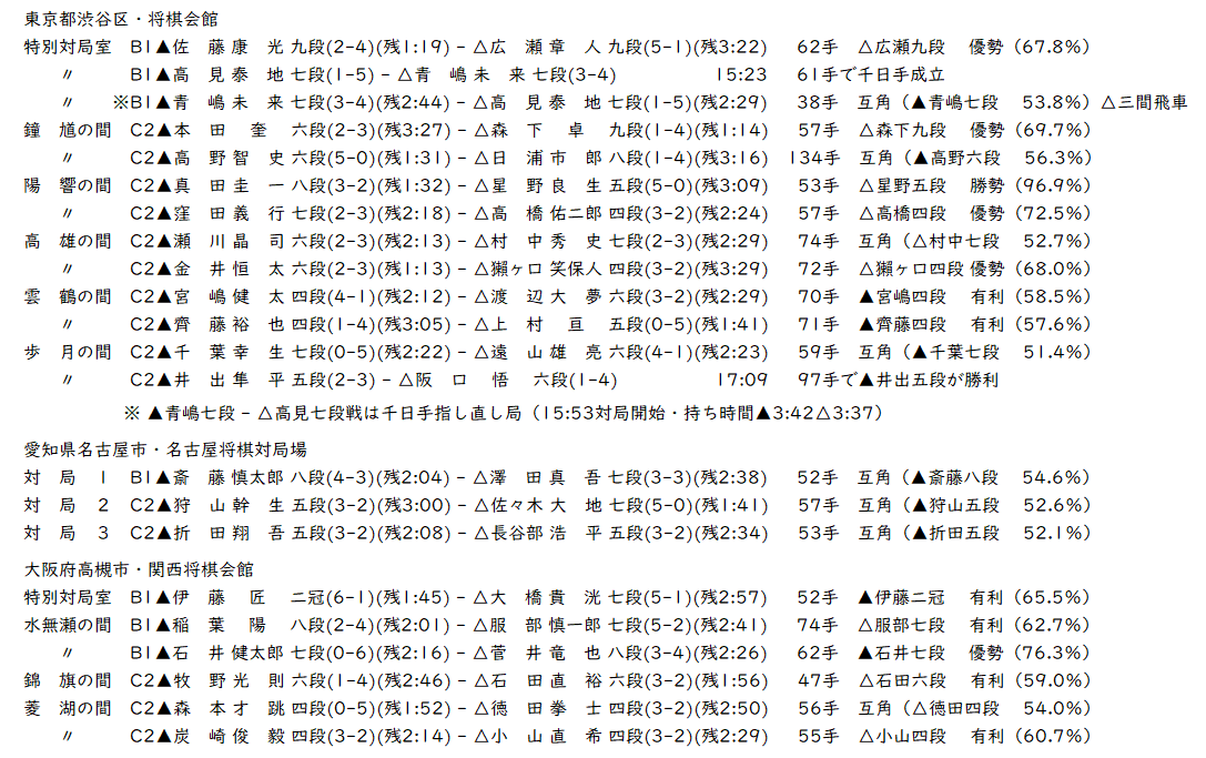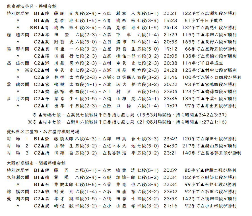 #順位戦 C2 6回戦(23:30以降に終局) 勝▲千葉幸生七段(0-5) - 敗△遠山雄亮六段(4-1) 23:36 135手 敗▲森本才跳四段(0-5) - 勝△徳田拳士四段(3-2) 23:58 142手 勝▲村中秀史七段(2-3) - 敗△瀬川晶司六段(2-3) 24:28 125手 勝▲狩山幹生五段(3-2) - 敗△佐々木大地七段(5-0) 24:30 217手 pic.x.com/sz26lRGznY