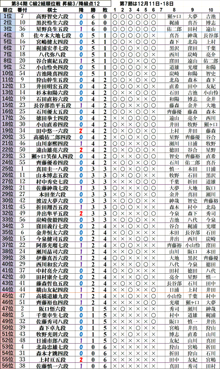 #順位戦 C級2組 6回戦 #黒沢怜生 六段が全勝キープ。 #八代弥 八段は初黒星です。 全勝3名、1敗7名となりました。 6-0 高野智,黒沢,星野 5-1 佐々木大,宮嶋,梶浦,八代,谷合, 小山怜,吉池 4-2 狩山,井田,杉本和,石田,長谷部, 石川,徳田,小山直,田中,高橋佑, 山川,遠山,獺ヶ口,齊藤優 ↓ pic.x.com/ZZMWH3rX78