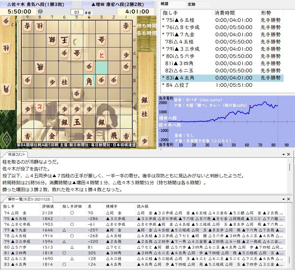 #増田康宏 八段の勝利 【第84期 #順位戦 A級】 ●佐々木勇気八段 VS ○増田康宏八段 第84期順位戦A級 佐々木勇気八段VS増田康宏八段戦が11月7日(金)に行われ、増田八段が83手で佐々木八段に勝ちました。 buff.ly/oZImSk0