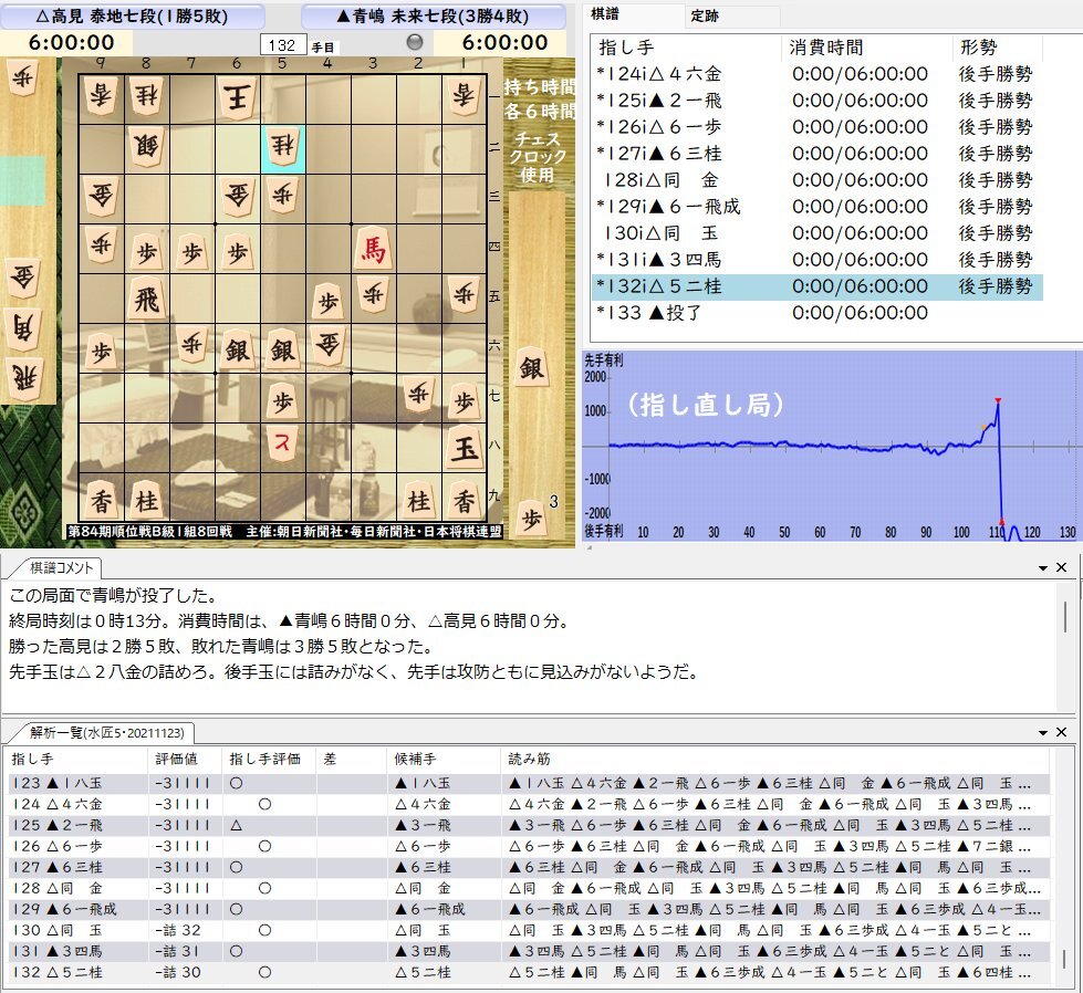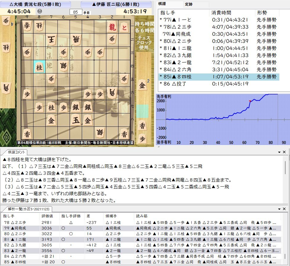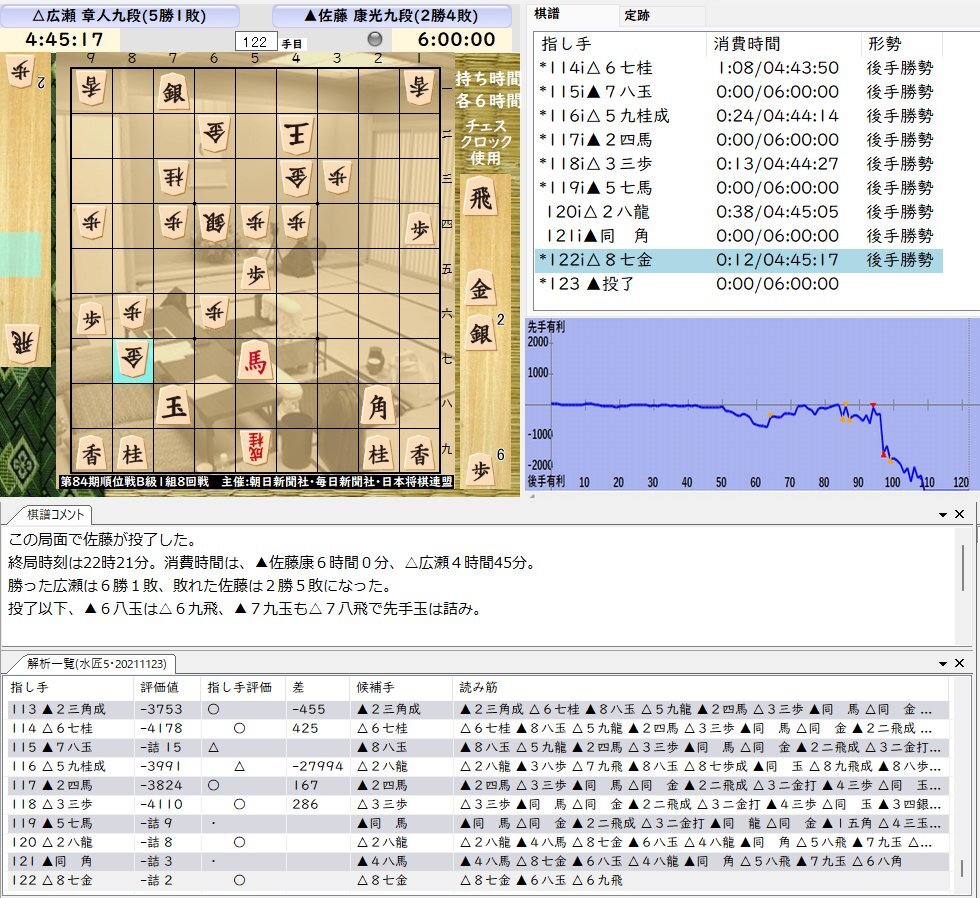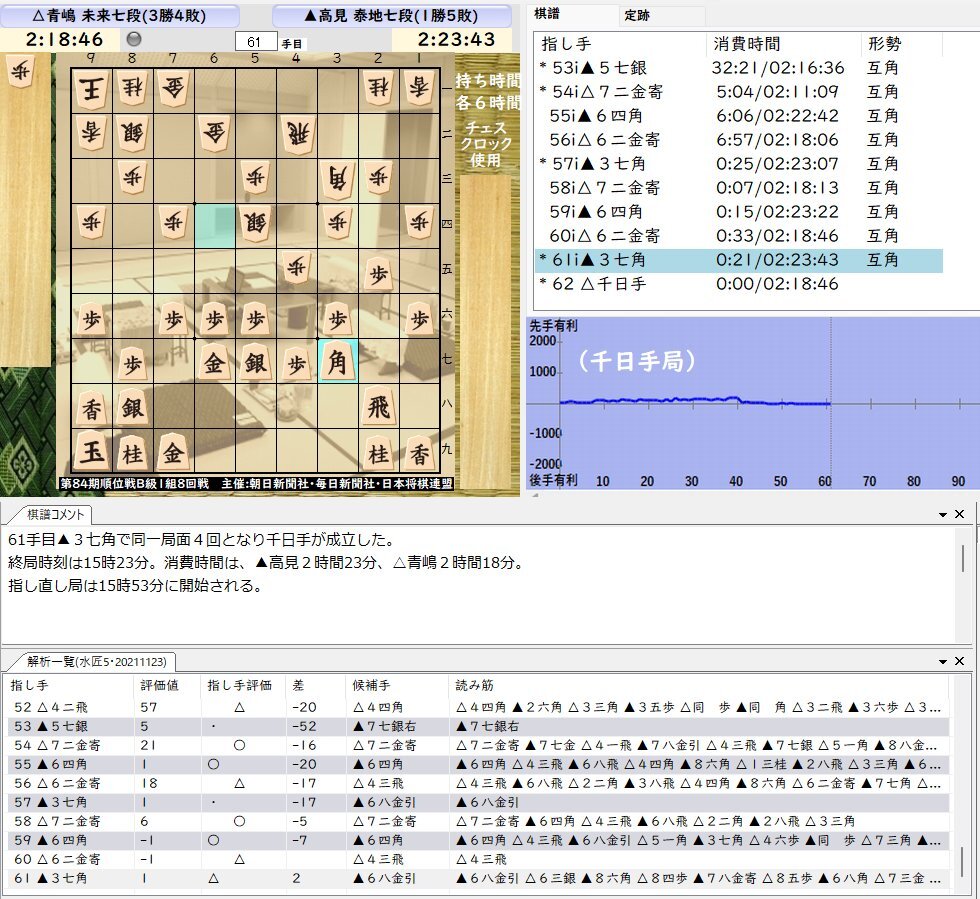 #順位戦 B級1組8回戦(22:30迄に終局の対局) 千▲高見泰地七段(1-5) - 千△青嶋未来七段(3-4) 15:23 61手 勝▲伊藤 匠二冠(6-1) - 敗△大橋貴洸七段(5-1) 20:59 85手 敗▲佐藤康光九段(2-4) - 勝△広瀬章人九段(5-1) 22:21 122手 pic.x.com/JMjSrkyOB2