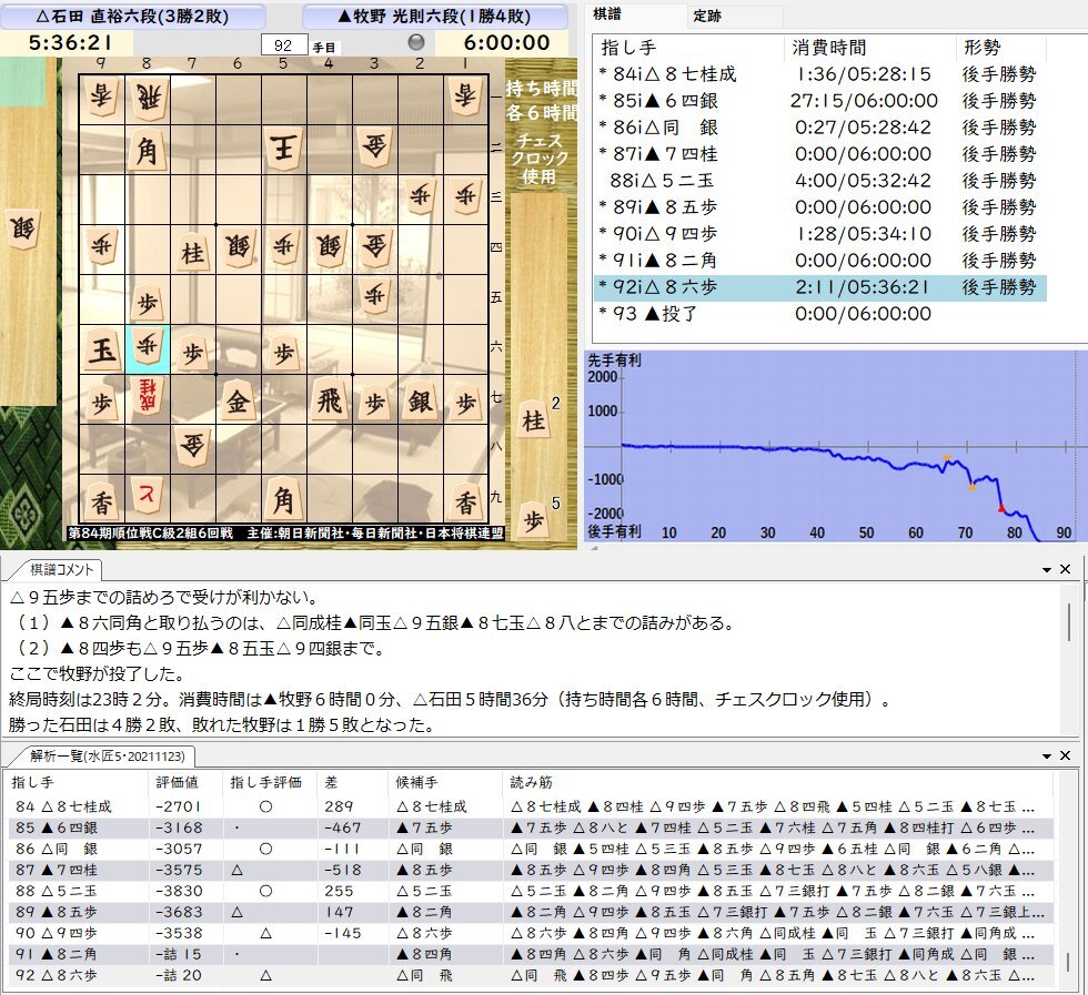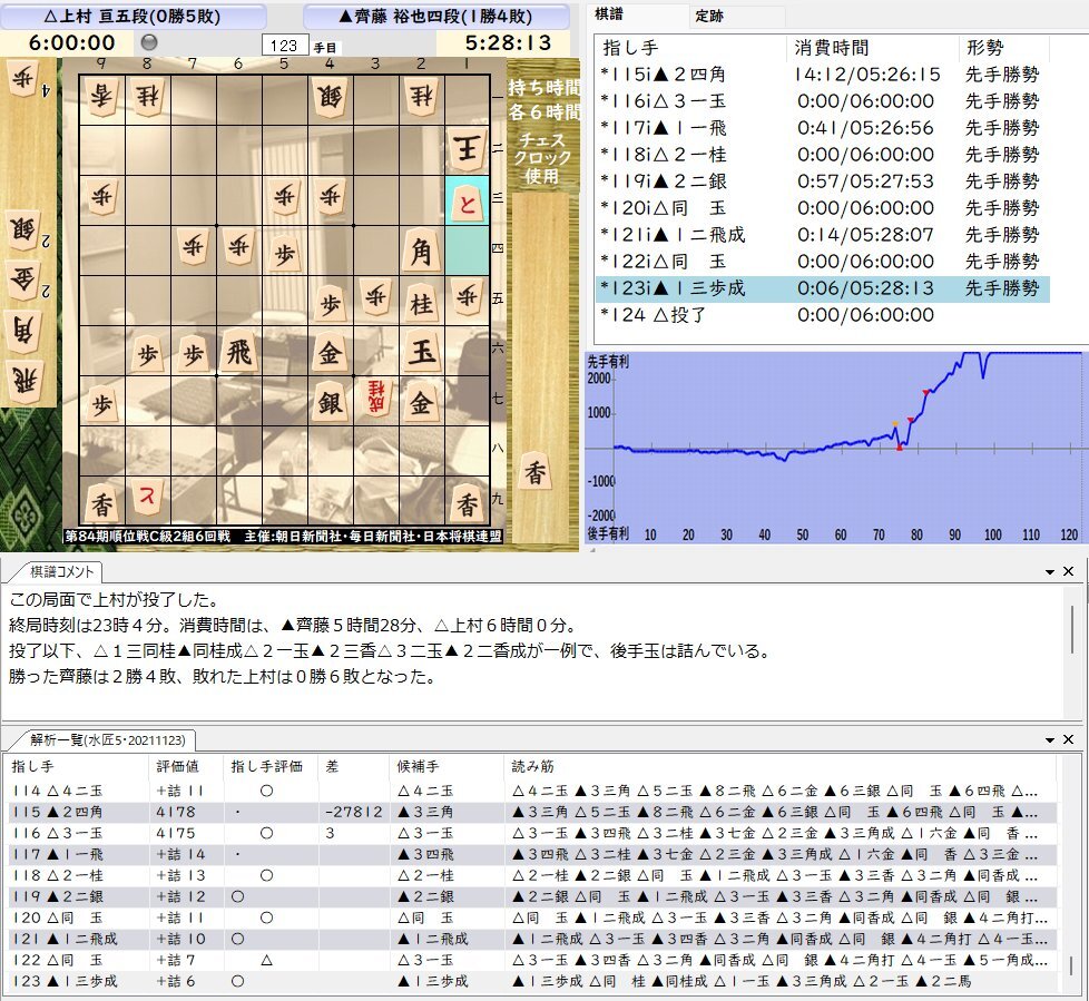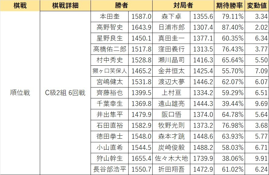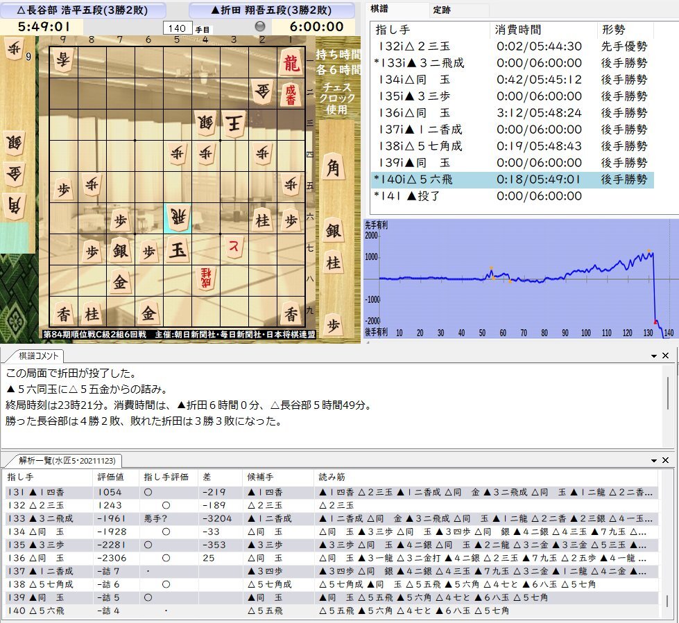 #順位戦 C2 6回戦(22時~23:30終局) 敗▲窪田義行七段(2-3) - 勝△高橋佑二郎四段(3-2) 22:05 138手 敗▲牧野光則六段(1-4) - 勝△石田 直裕六段(3-2) 23:02 92手 勝▲齊藤裕也四段(1-4) - 敗△上村 亘五段(0-5) 23:04 123手 敗▲折田翔吾五段(3-2) - 勝△長谷部浩平五段(3-2) 23:21 140手 pic.x.com/bxbTpP5MCd