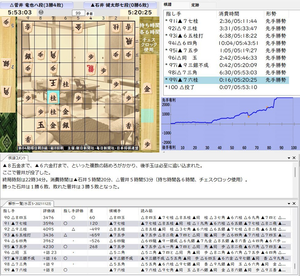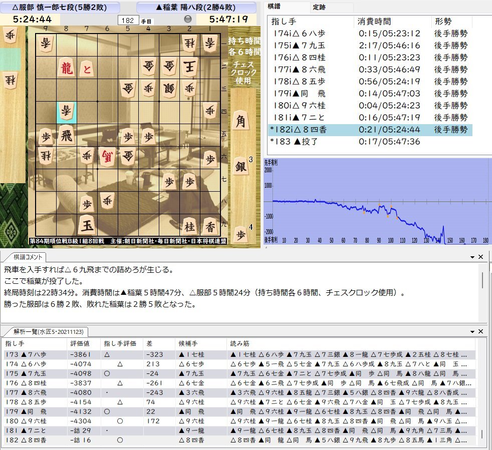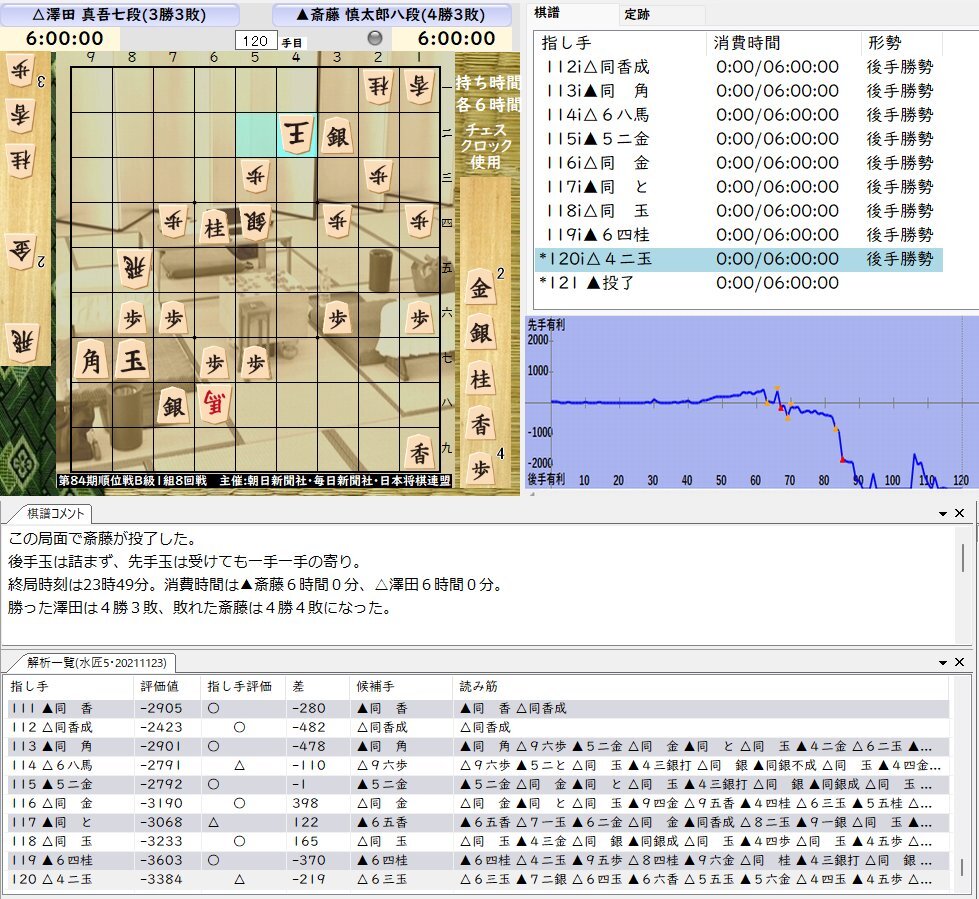 #順位戦 B1 8回戦(22:30以降に終局) 勝▲石井健太郎七段(0-6) - 敗△菅井竜也八段(3-4) 22:34 99手 敗▲稲葉 陽八段(2-4) - 勝△服部慎一郎七段(5-2) 22:34 182手 敗▲斎藤慎太郎八段(4-3) - 勝△澤田真吾七段(3-3) 23:49 120手 敗▲青嶋 未来七段(3-4) - 勝△高見泰地七段(1-5) 24:13 132手 pic.x.com/3zi5dqbPcl