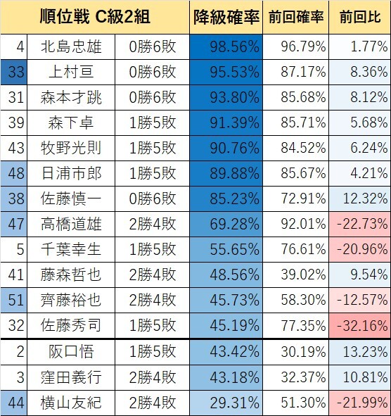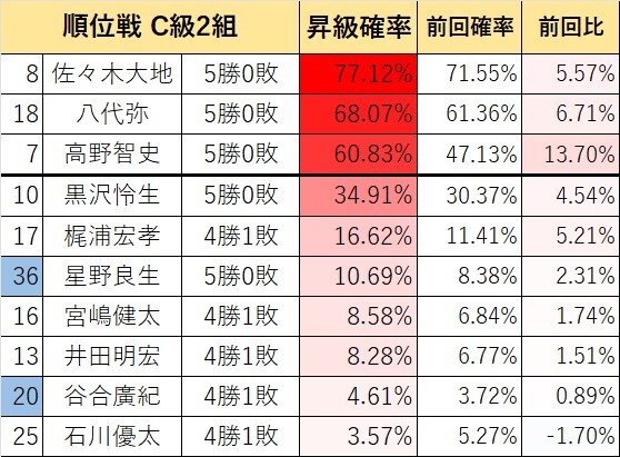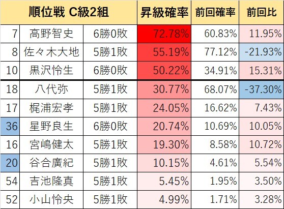#順位戦 C級2組 5回戦終了 確率分析 昇級争いは #佐々木大地 七段がトップをキープ。 昇級圏内の #八代弥 八段と #高野智史 六段が頭一つ抜けています。 #黒沢怜生 六段が4番手で追います。 残留争いは #上村亘 五段がフリークラス陥落の危機。 12枠中80%以上が7名と、 脱出が難しくなってきています。