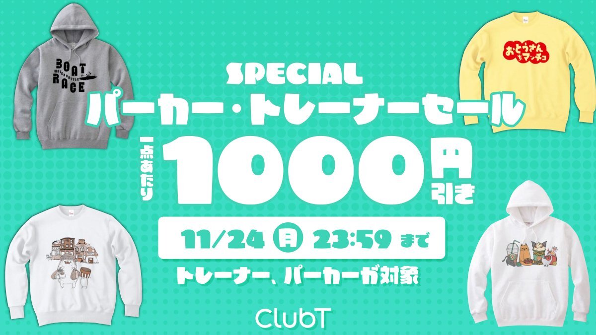 暦の上では冬となり、朝夕はだいぶ肌寒くなってきました🌬 パーカー・トレーナーセールやりますよ!✨ 11月24日(月)いっぱいまで使えるクーポンを発行いたしました「chilly2025」🎉 パーカー・トレーナー対象1点あたり1000円引きです!!✨ clubt.jp  #clubt  #デザインTシャツ pic.x.com/694etPkFDR