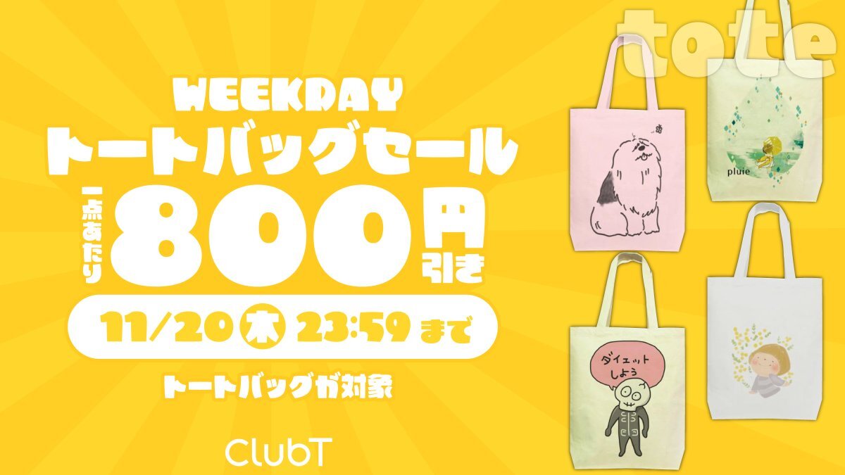 あっという間に11月も半ばですね🥰 トートバッグセールやりますよ!✨ 11月20日(木)いっぱいまで使えるクーポンを発行いたしました「fruit2025」🎉 トートバッグ対象1点あたり800円引きです!!✨ clubt.jp  #clubt  #デザインTシャツ pic.x.com/n2HioArBz0