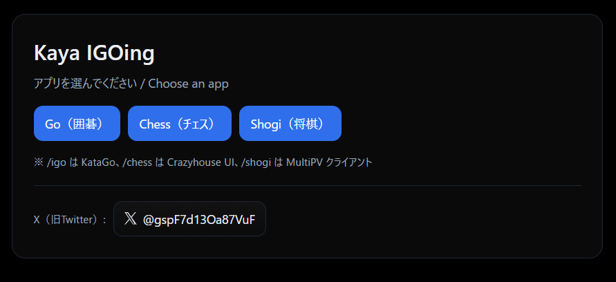 Sum (まとめ):kayaigoing.org Go (中盤から) kayaigoing.org/igo/ Chess(持ち駒あり) kayaigoing.org/chess/ Shogi (候補手あり) kayaigoing.org/shogi/ #Go #Baduk #Weiqi #Chess #Crazyhouse #将棋 #Shogi pic.x.com/mY4tHZmZNz