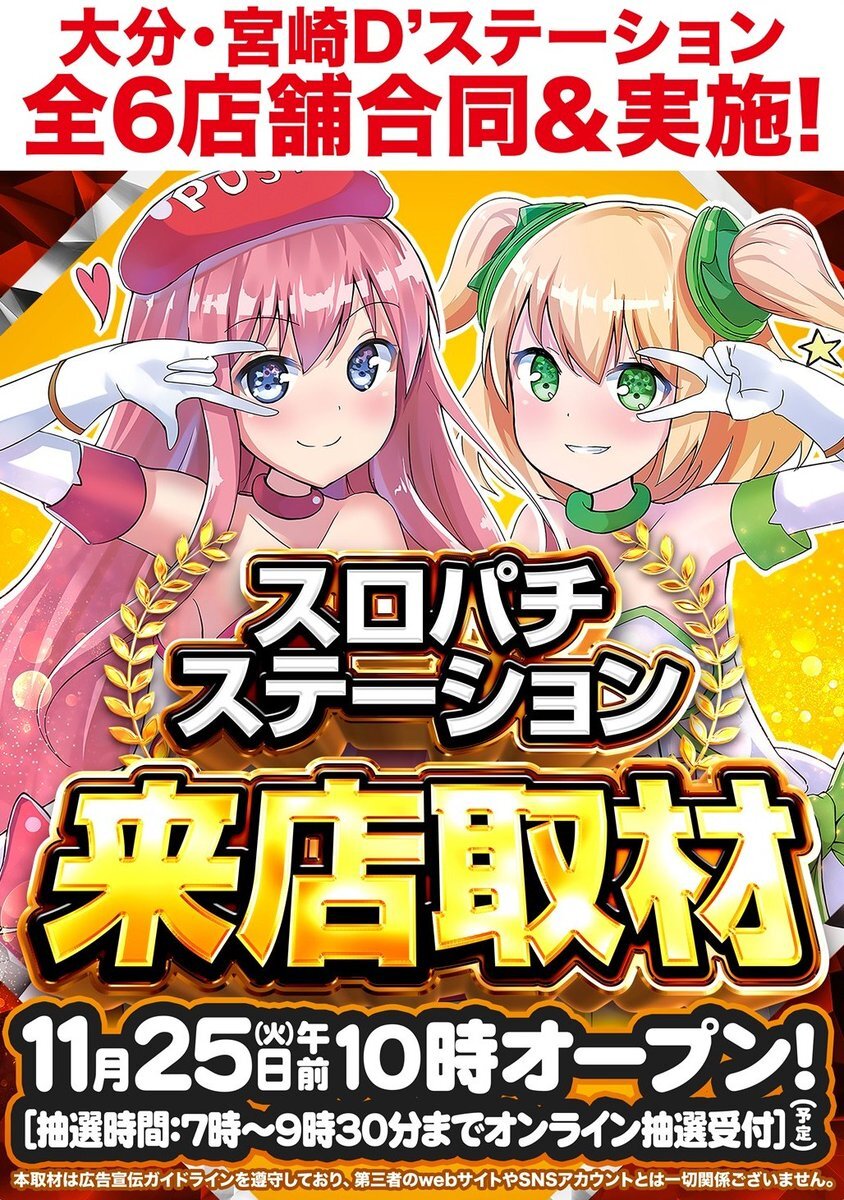 本日の結果の前に、 明日11月25日[火曜日]のご案内✨️ もはや毎月25日の恒例! 大分・宮崎D'ステーション 全6店舗合同実施👍 『スロパチステーション 来店取材』 明日は39南大分店へ『GO!!』 777.slopachi-station.com/%e3%80%9010%e6… #25日 #スロパチ #来店 #Dステ南大分 #GO pic.x.com/eEQ6IZmwV9