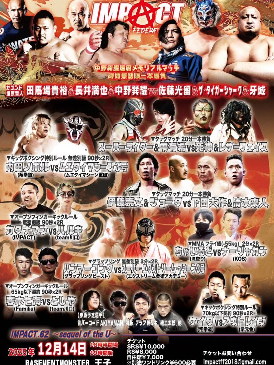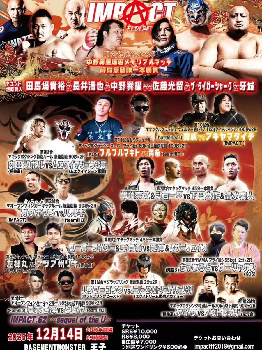 #IMPACT #格闘技 #プロレス IMPACT観に行きましたわ。 ベースメントモンスター王子での試合はアングラな感じがして、とても良い!! 痛快な試合も多かったし、メインのプロレスは最高やった。 また来年やな。 pic.x.com/dEOuZ42zXY
