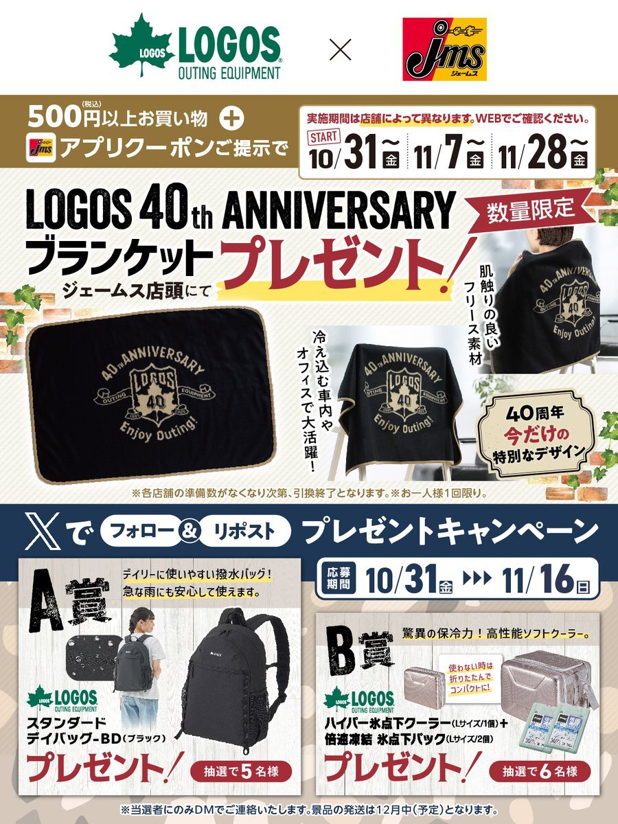 🍁LOGOS×ジェームス キャンペーン🍁 1⃣Xフォロー&リポストで当たる🎯 ロゴスの人気アイテムが抽選で計11名様に! ※応募〆 11/16 2⃣店頭でプレゼント🎁 500円以上のお買い物+ジェームスアプリクーポン提示で【ロゴス40周年ブランケット】がもらえる! ※開催店舗・期間はWEBで確認してね👀