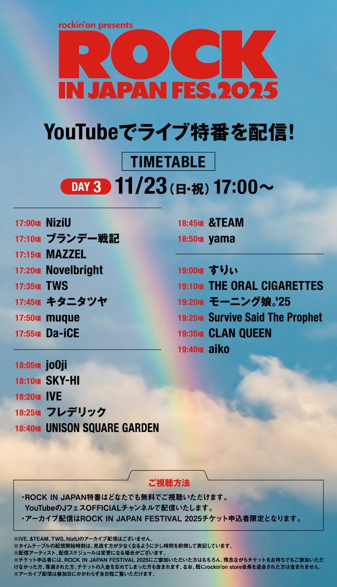 【お知らせ】 11/23(日・祝) 17:00からプレミア公開となるYouTube「JフェスOFFICIALチャンネル」 特別番組のタイムテーブル解禁! aikoは19:40頃〜スタートとなります。 ROCK IN JAPAN FESTIVAL 2025のライブ映像をぜひご覧ください。 ※配信はリアルタイムでのみ視聴可能 youtube.com/@rockinon