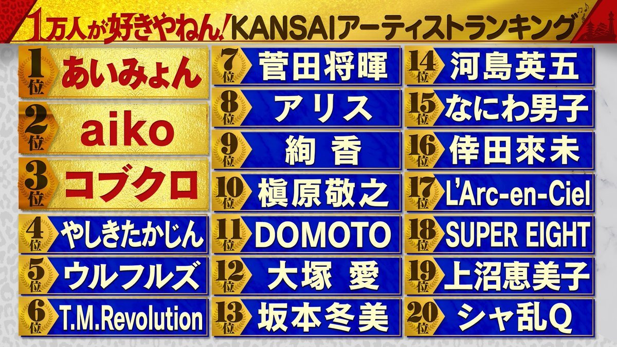 \ #KANSAIアーティストランキング 最終結果🏆/ 🔥 関西人1万人が選んだ 🔥 好きな関西出身アーティスト・ベスト20✨ 👑栄えあるトップ3は 🥇全世代で1位 #あいみょん さん 🥈恋する乙女の代弁者 #aiko さん 🥉万博のテーマソング担当 #コブクロ このあとOAであいみょんさんのコメントをお届け💕 pic.x.com/xBJshd0t6C