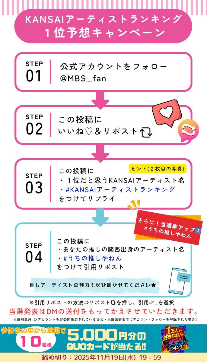 / 抽選で10名様に 5000円分のQUOカードをプレゼント🎁 \ 11/19(水)20時~ #KANSAIアーティストランキング 1位予想キャンペーン💜 ① @MBS_fan をフォロー ② 本投稿をリポスト&いいね ③ 1位予想に #KANSAIアーティストランキング をつけて本投稿に返信 さらに当選率UP企画も⁉️ 詳細とヒントは👇