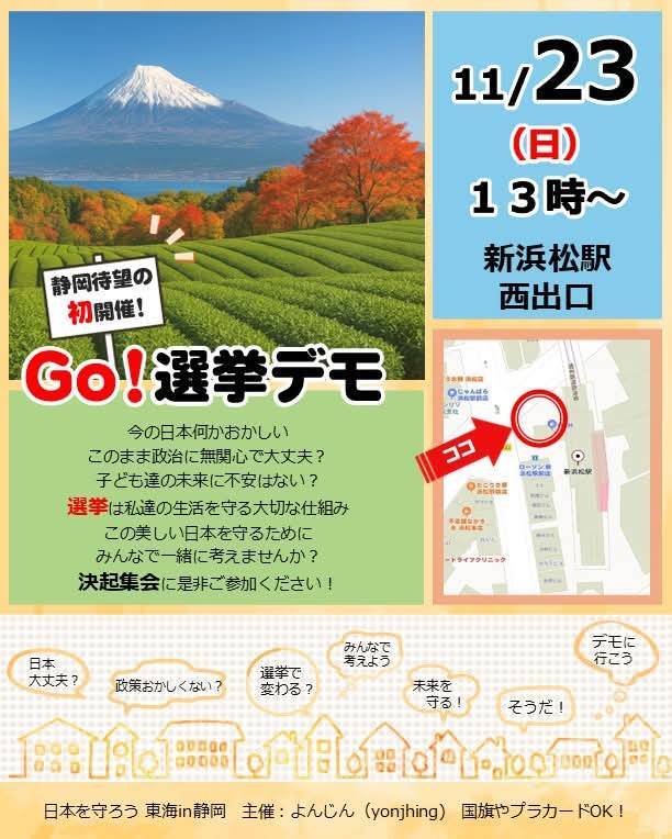返信先:@shizuokashikoho#静岡 #新浜松駅 #選挙 #GO!選挙デモ #デモのお知らせ #日本を変える #移民反対 11/23日【13時から】 x.com/usagidesyo/sta…