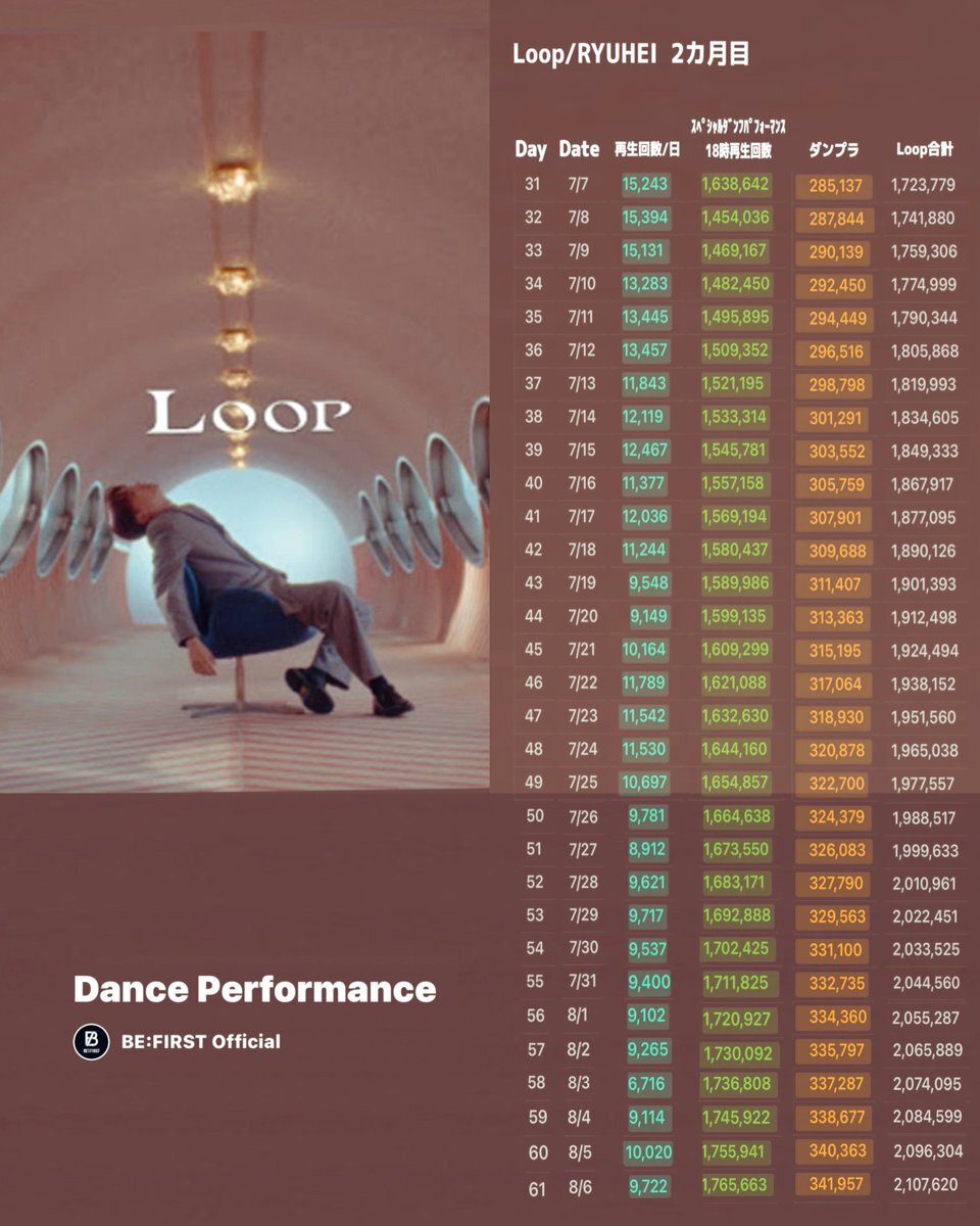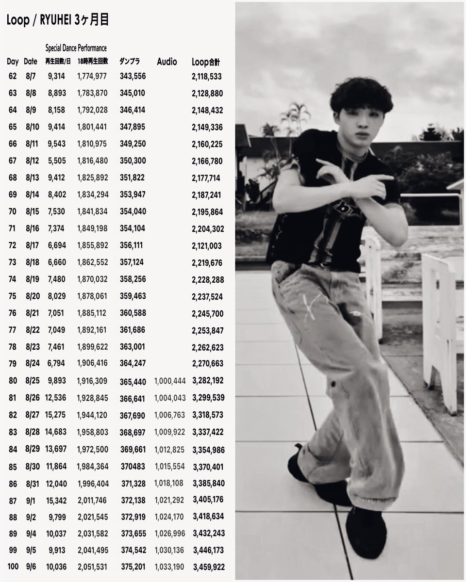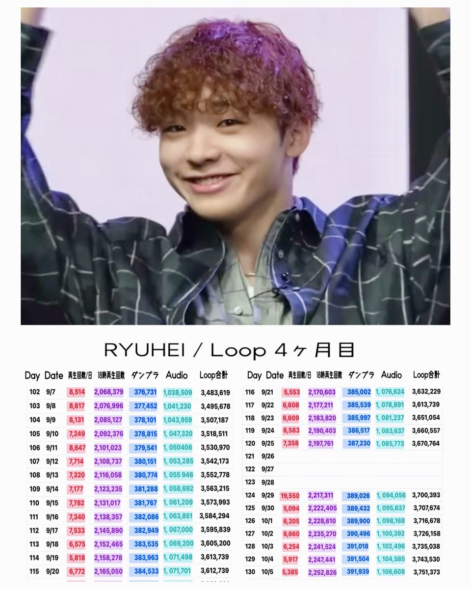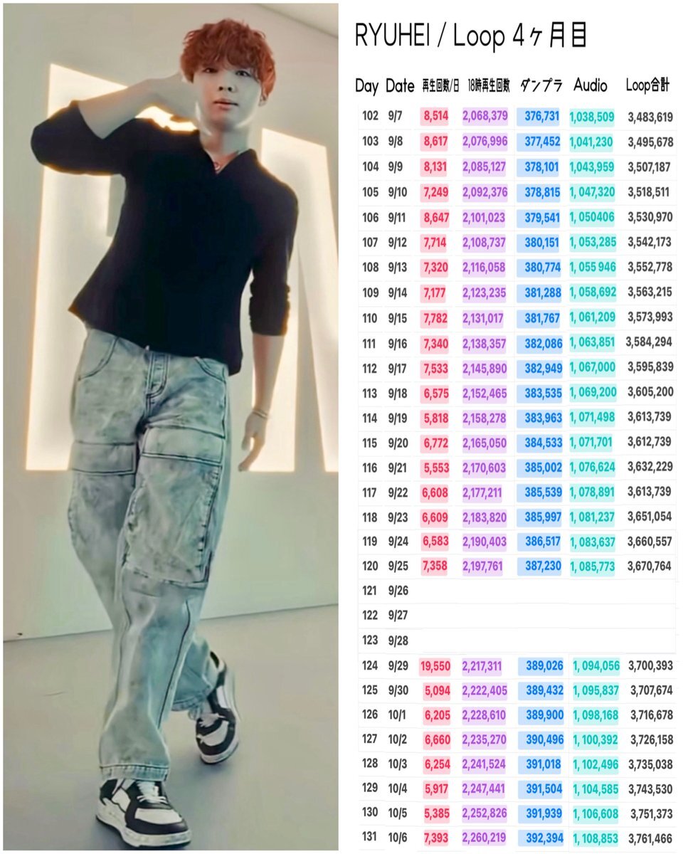Loop / RYUHEI カウンターDay 131 💎Special Dance Practice 💎ダンプラ 💎Official Audio 4ヶ月目最終日🗓️ Stare In Wonder Lyric Videoと ともにLoop再生回数も上昇へ⤴️ 今夜からさらに盛り上けていきた いですね💕 #Loop #RYUHEI pic.x.com/XMRmMSlWhF