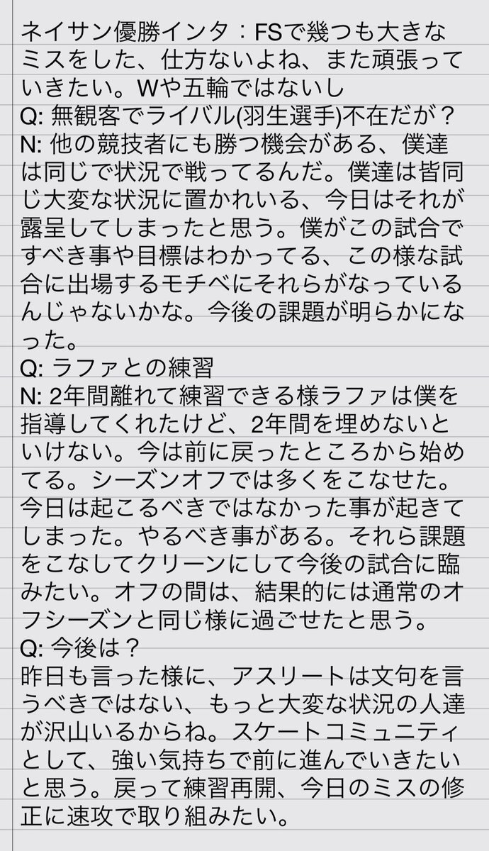スケアメ ネイサン優勝インタビュー #SkateAmerica2020 #nathanchen FSで幾つも大きなミスをした、仕方ないよね、また頑張っていきたい。 今後の課題が明らかになった。 スケートコミュニティとして、強い気持ちで前に進んでいきたいと思う。戻って練習再開、今日のミスの修正に速攻で取り組みたい。 pic.x.com/BWGyJPIZp9