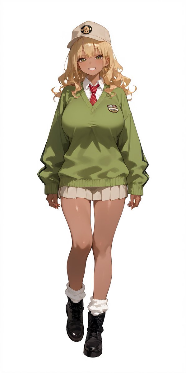 🌟ぎゃるコレ🌟 0⃣3⃣9⃣ ※Ponyモデル向けの衣装です。 beige newsboy cap with hip hop motif decorations, wear a moss green pullover sweater over a white collared-shirt, oversized moss green pullover sweater with logo and white accent lines, white collared-shirt, (red loose tie),