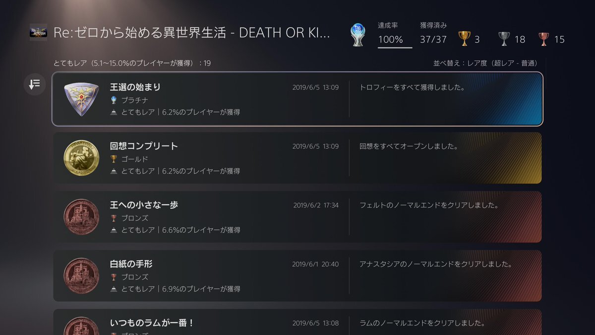 #トロコン 100% T0226 #プラチナトロフィー P0252 🎮Reゼロから始める異世界生活 DEATH OR KISS #PS4 📅取得日:2019/06/05 ⭐難易度:★★★☆☆ 💖好き度:★☆☆☆☆ ⏱️プレイ時間:21H 📝感想:最後5作品目。有名作品。大変でした。 #Reゼロから始める異世界生活 #リゼロ pic.x.com/B4ln1ijchy