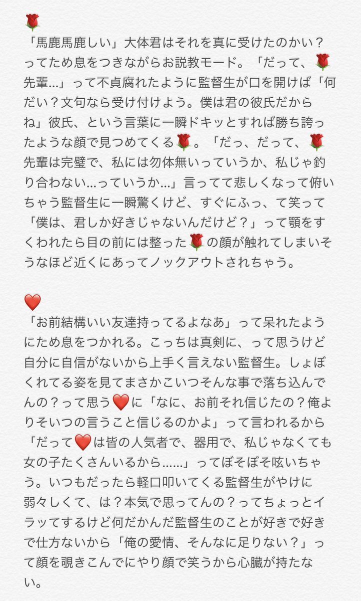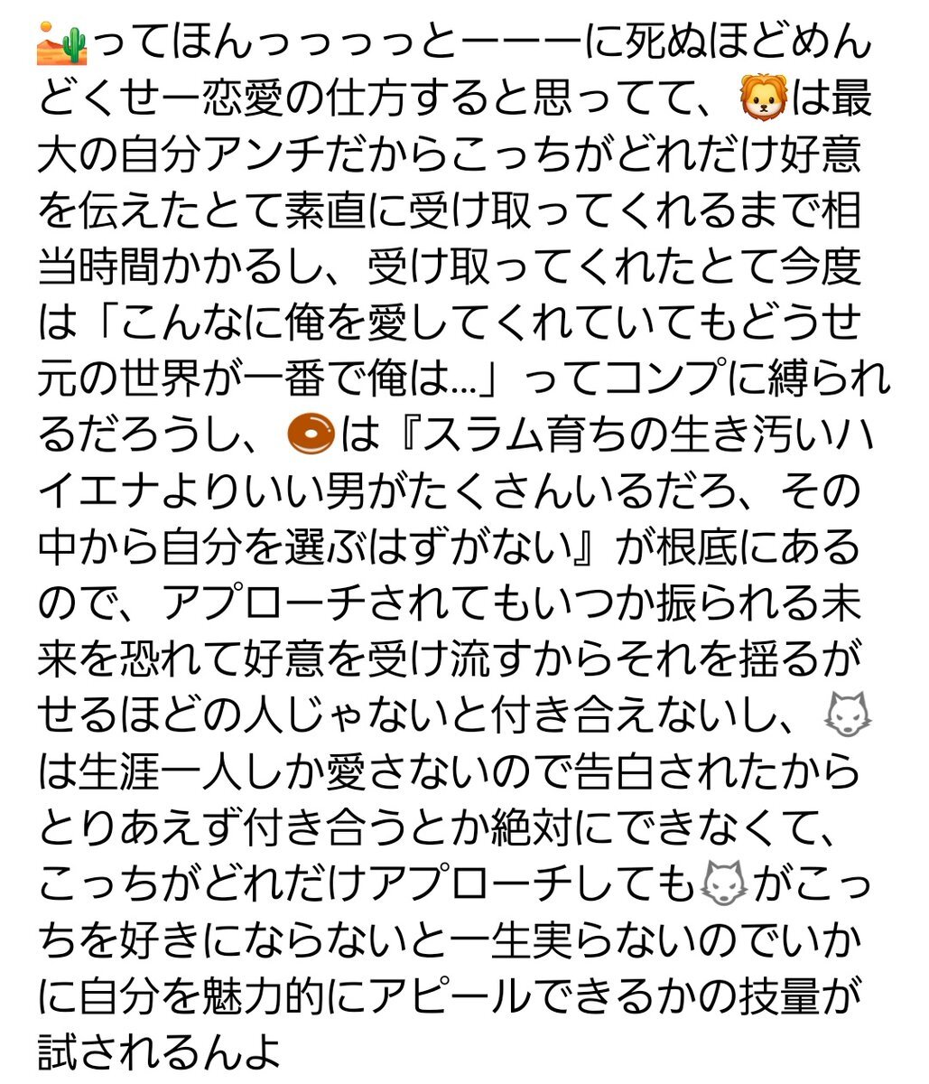 #twstプラス #twst夢 🏜監 🏜ってほんっっっっとーーーに死ぬほどめんどくせー恋愛の仕方すると思ってて、🦁は最大の自分アンチだからこっちがどれだけ好意を伝えたとて素直に受け取ってくれるまで相当時間かかるし、受け取ってくれたとて今度は「こんなに俺を愛してくれていてもどうせ元の世界が一番