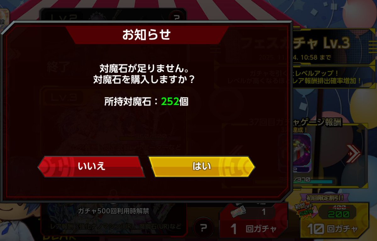 初回限定は200対魔石で10回ガチャ。(´・ω・`) 現在252対魔石を持ってて足りないと言われる素敵なゲームです。 多分アレだ、私の所持している対魔石と表示されている10連ガチャの数値はきっと別の単位なんだよ。 普通にバグだと思うけど。 #アクション対魔忍 pic.x.com/KE0l04TGVj