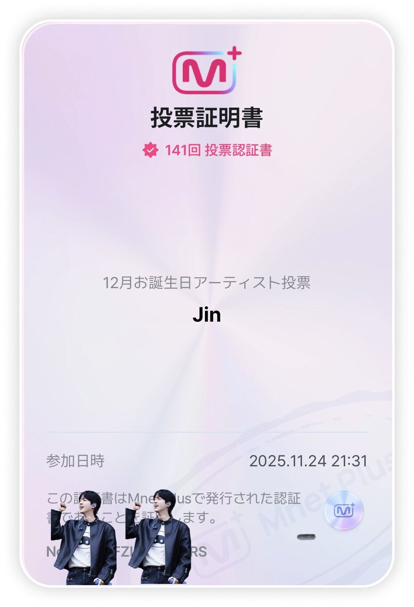 Mnet Plus 12月 誕生日アーティスト投票 JINくん1位おめでとうございます✨ ドキドキした〰️😮💨 お寝坊しちゃったけど、グクミンのめざまし⏰サイコロ🎲見られてよかった☺️朝から幸せ💗 (テテのCMも初😆) そして12時タルソク物販 wootteoT迷い中 #BTSJIN #アミ活 pic.x.com/nTFSlrzC3V