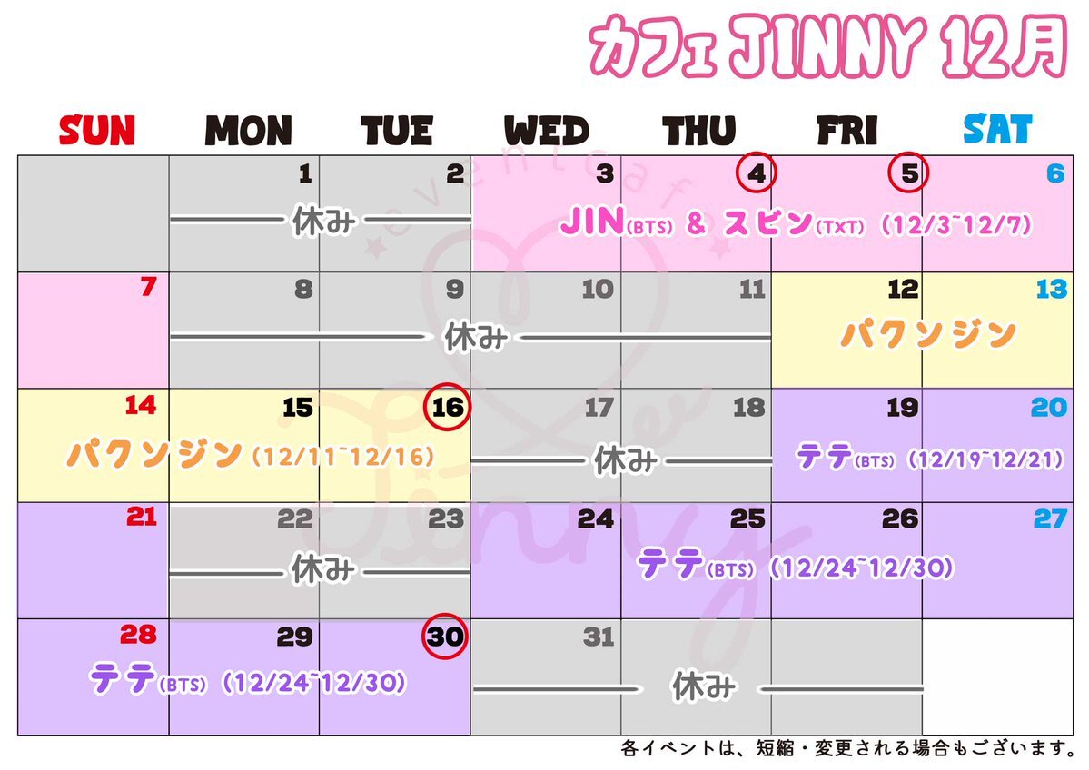 ★12月𝙲𝚊𝚏𝚎 𝙴𝚟𝚎𝚗𝚝★ ・12/3~12/7 ➫BTS JIN&TXTスビン ・12/12~12/16 ➫パクソジュン ・12/19~12/30 ➫BTSテテ カフェJINNYは1時間のドリンクバー付きのイベントカフェです。 新大久保駅徒歩5分! センイルカフェ♡お祝いカフェ pic.x.com/6mym9QZbMm