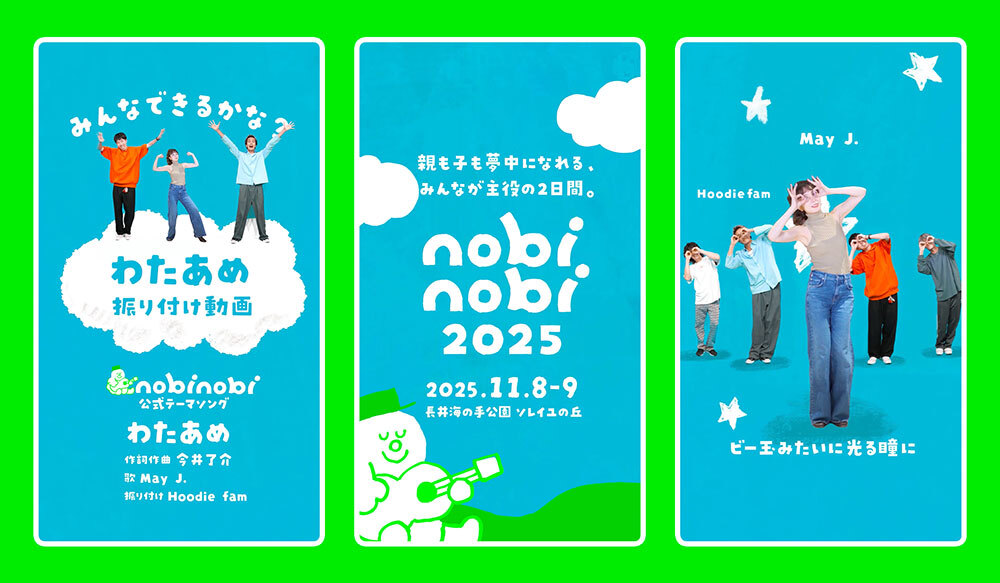 #nobinobi2025 <最終先着先行>受付中‼️ 公式テーマソング「わたあめ」(うた:May J./作詞作曲:今井了介/振付:Hoodie fam)が完成🪩 May J.さんは11/9(日)、Hoodie famさんは11/8(土)&11/9(日)に出演予定🎶 みんなでいっしょに歌って踊って楽しもう🌟 🎫詳細はこちら👇 pic.x.com/YgBtQk1d8N