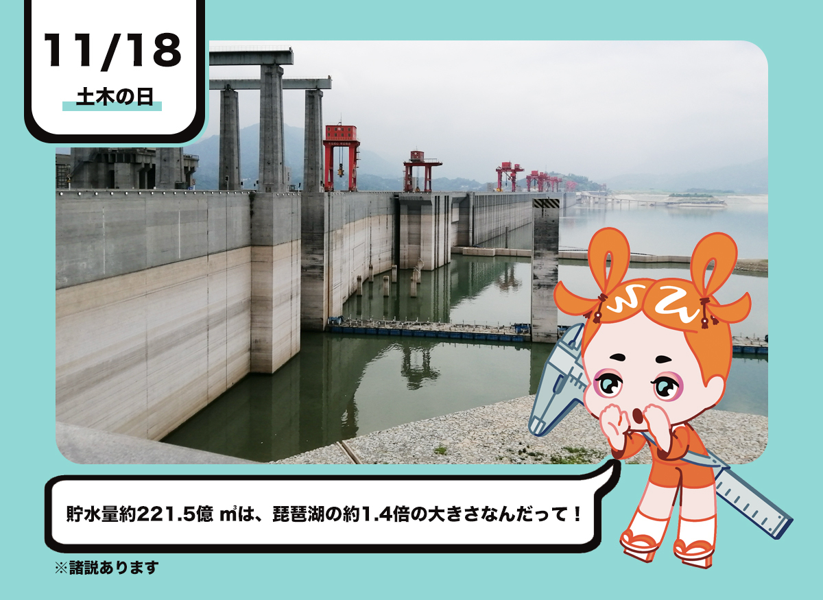 11/18は #土木の日! 中国にある世界最大級の「三峡ダム」は高さ約185 m、幅約2,300 mという超巨大構造物! ダム湖は貯水量約221.5億 ㎥(有効貯水容量)を持っていて、これは琵琶湖の約1.4倍の大きさなんだって。めちゃデカい! 長江の洪水制御や水力発電を担っているよ! pic.x.com/ztp2UDQVdz