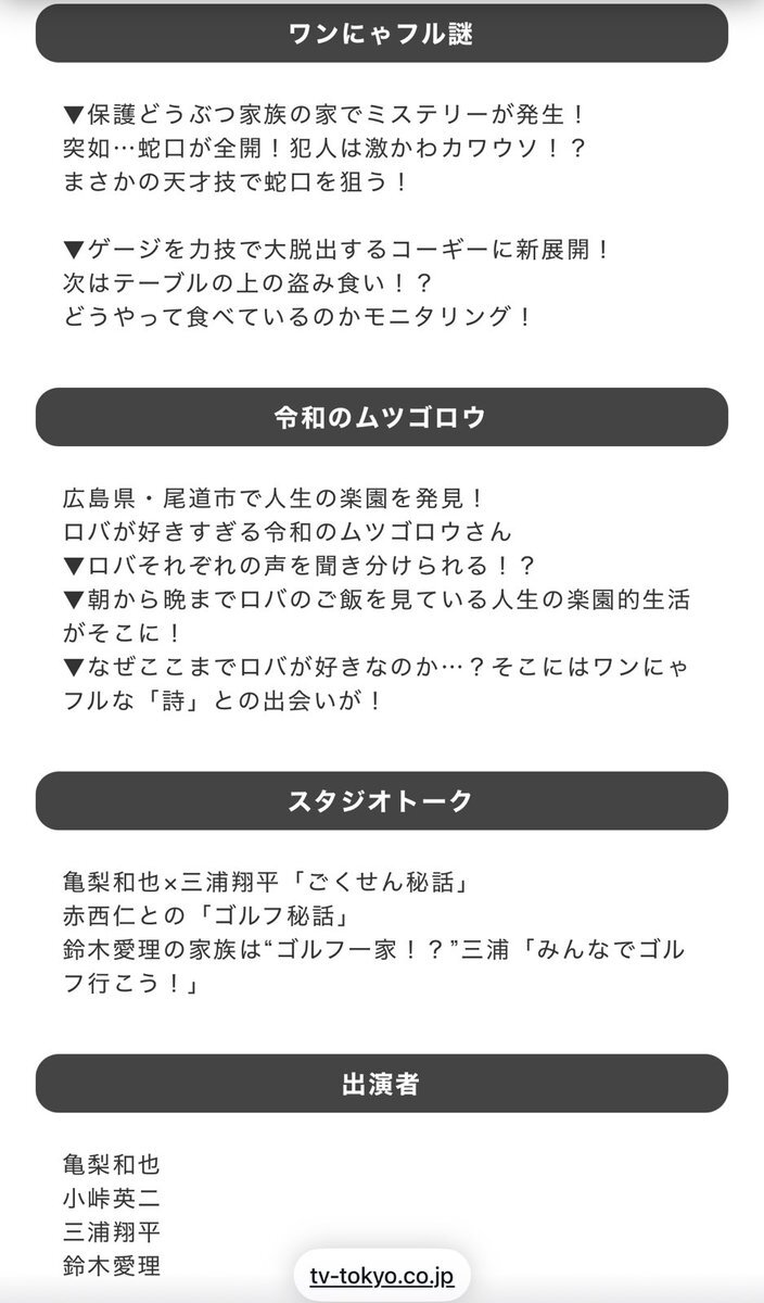 亀梨和也×三浦翔平「ごくせん秘話」 赤西仁との「ゴルフ秘話」 鈴木愛理の家族は“ゴルフ一家!?”三浦「みんなでゴルフ行こう!」 あのネコちゃん、とんでもねえ爆弾持って出演する気だぞ tv-tokyo.co.jp/wan_nyafulstor…