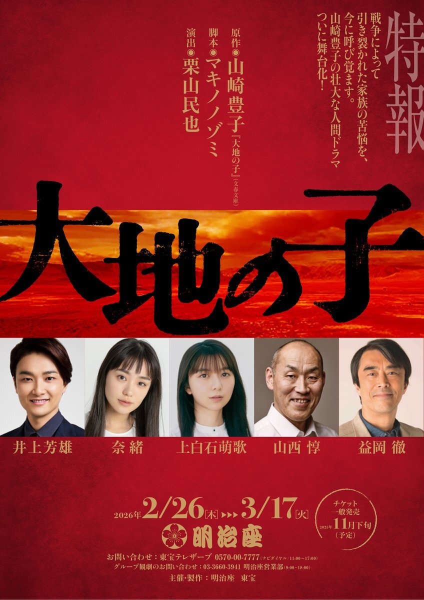 📢 謹告 #プラみちゃん #イープラス貸切公演 決定❣️ 『 #大地の子#明治座 #井上芳雄 #奈緒 #上白石萌歌 #山西惇 #益岡徹 #飯田洋輔 #浅野雅博 ほか 原作: #山崎豊子 『 大地の子 』(文春文庫) 脚本: #マキノノゾミ 演出: #栗山民也 🗓️3/1(日)12:00 🗓️3/12(木)13:00 🎟️10/17(金)~最速先行‼️ pic.x.com/9lAM8qNWdl