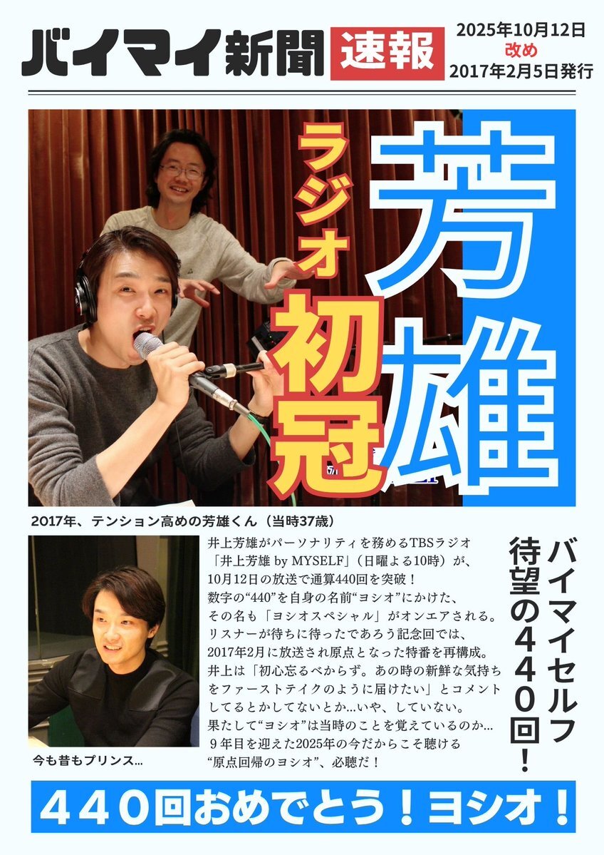 10/12(日)今夜10時は❗️ #井上芳雄byMYSELF ✨放送440回✨ #芳雄一味 必聴👂#ヨシオスペシャル ‼️ #井上芳雄 #大貫祐一郎 2017年ラジオ初タッグの特番を 再構成でお届けします♪ 🎧➡️井上芳雄 by MYSELF TBSラジオ 2025/10/12(日) 22:00-22:30 radiko.jp/share/?t=20251…