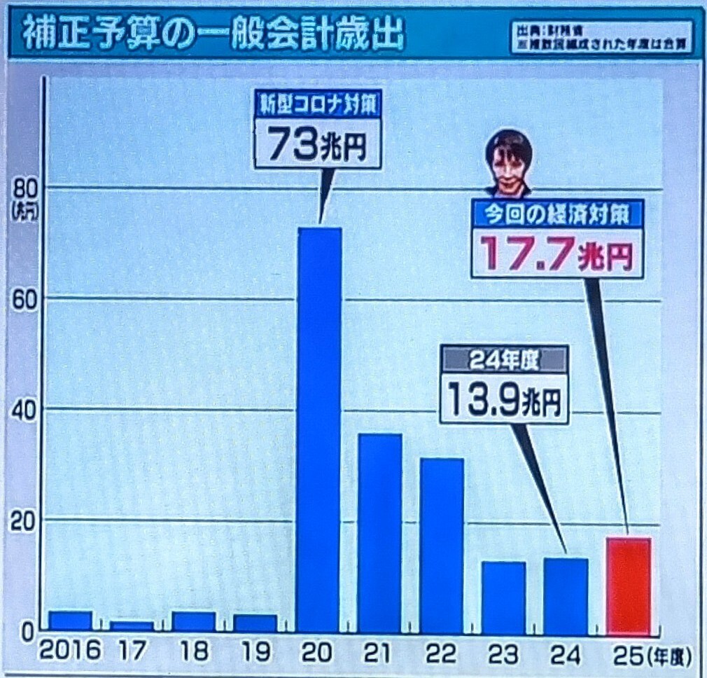 箍が外れてる… 補正予算の問題点 ①溶け込み 決算報告書の支出済歳出額は補正と当初予算等が合算その為いくら使われたか把握難しい ②繰越 年度内に補正を使い切れず翌年に繰越ケース多く無駄に積まれた予算も財源は赤字国債 総合経済対策21.3兆円 2025年度補正17.7兆円で前年度超え #報道1930
