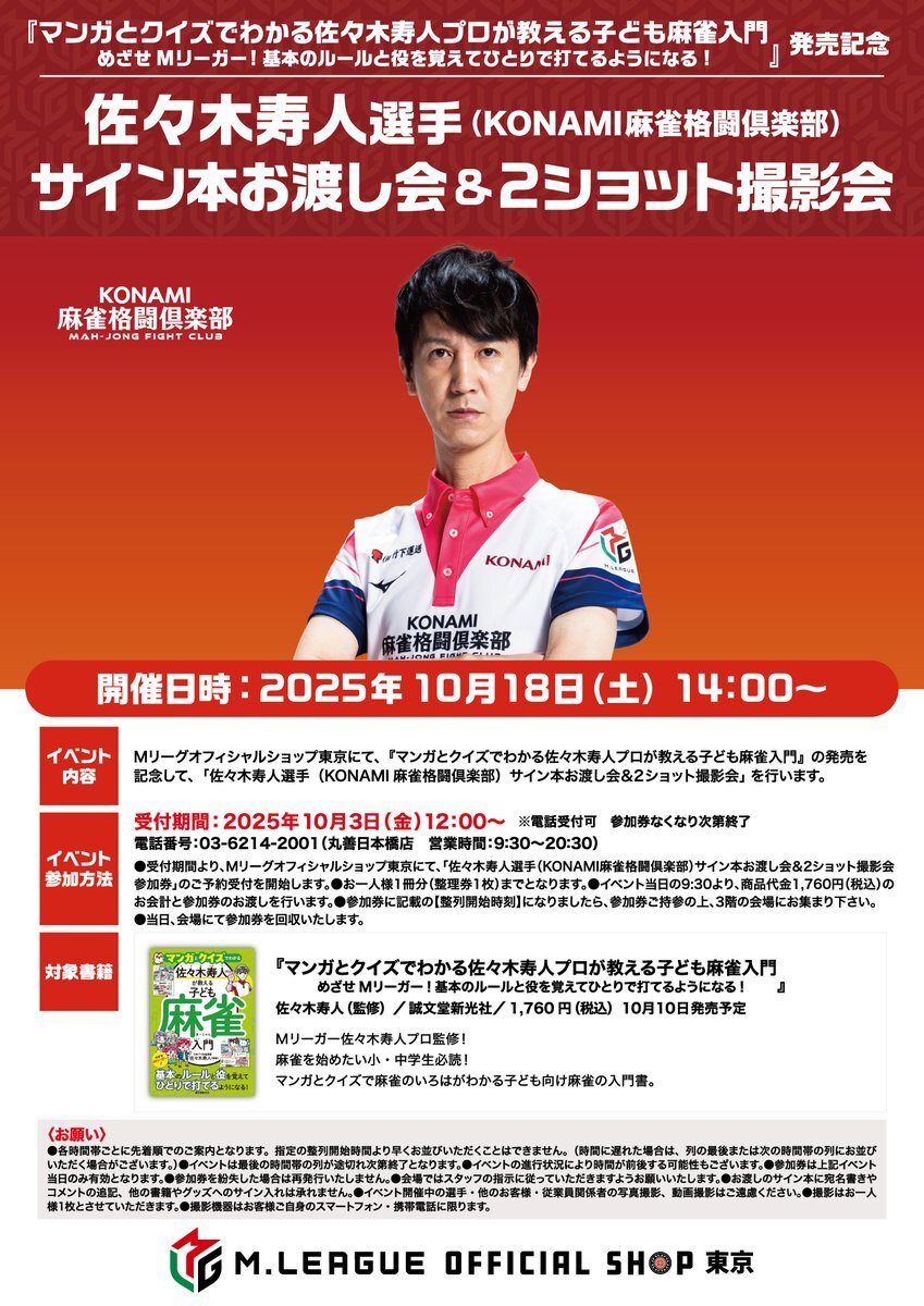 【東京🗼】 \イベント開催のお知らせ✨️/ #KONAMI麻雀格闘倶楽部 #佐々木寿人 選手 誠文堂新光社 『マンガとクイズでわかる 佐々木寿人プロが教える子ども麻雀入門』刊行記念 サイン本お渡し会&2ショット撮影会 開催 :10月18日(土)14:00~ 受付 :10月3日(金)12:00~ ※店頭及び電話での受付です