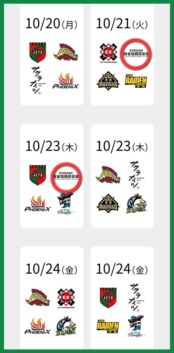 【10/20(月)~10/24(金)スケジュール】 KONAMI 10/21(火)&23(木)登板Week🐲 2日とも遅参リアタイ👀 いつでも!どこでも!KONAMI全力応援📣 今週もよろしくお願いします☺️ #Mリーグ #KONAMI麻雀格闘倶楽部 #佐々木寿人 #高宮まり #伊達朱里紗 #滝沢和典 監督 pic.x.com/KigQz1ilpa