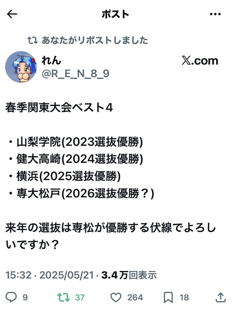 春にリポストさせてもらった投稿。その時はそうなったらいいなぁくらいに思ってたけど、一歩、また一歩と近づいていくのを観ていると今応援しているのはとんでもないチームじゃないのか!と思いワクワクが止まらない! #専松 #専大松戸 #専修大松戸 pic.x.com/GLIdqr8AqA