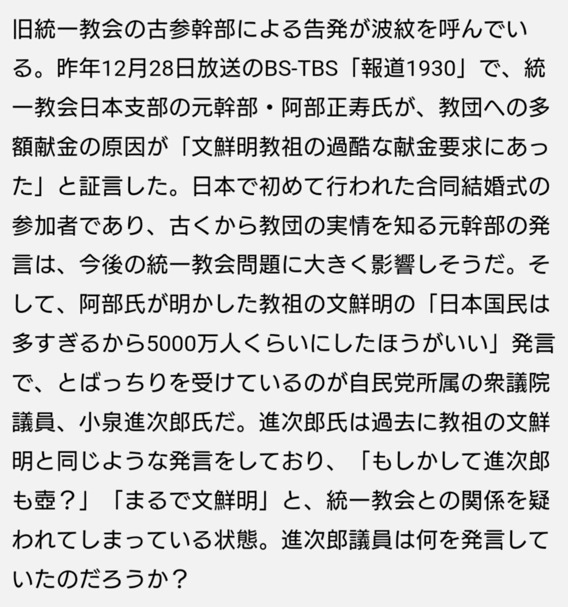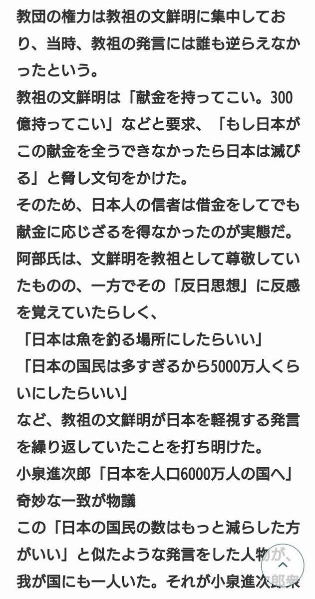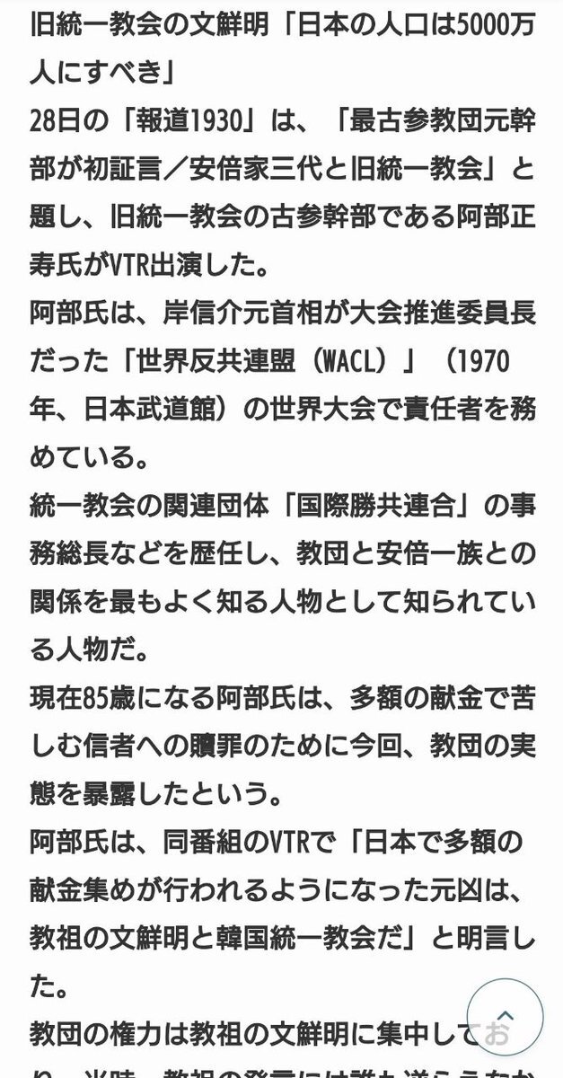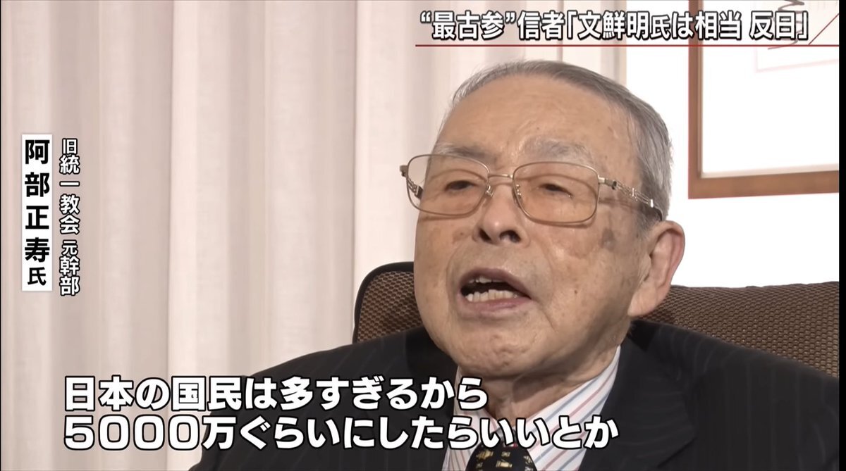 #統一教会 の教祖 #文鮮明 の発言で「日本国民は多すぎる5000万人くらいに減らせ」という内容が、元幹部・阿部正寿氏の証言(2022年BS-TBS「報道1930」)で報じられる。 これは教団の献金圧力の文脈で語られたもので日本を「怨讐の国」と位置づけ人口削減を促す反日的なニュアンスを含むと指摘される