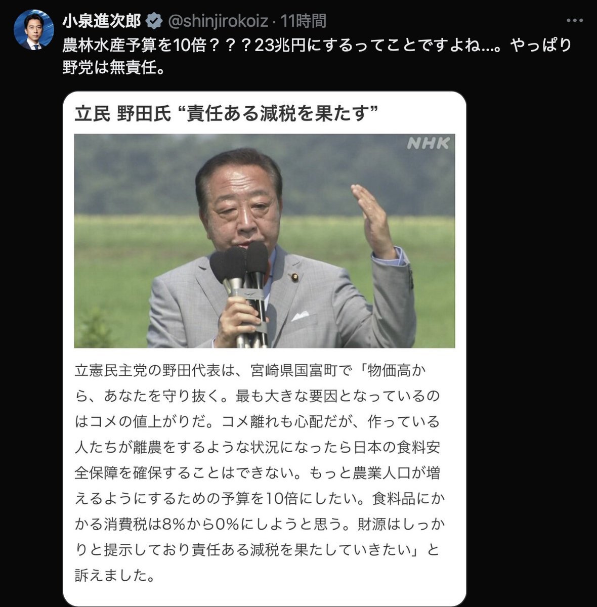 #自民党政治を終わらせよう 「もっと農業人口が増えるようにするための予算を10倍にしたい」という立憲・野田代表の発言を「農林水産予算を10倍???」と捻じ曲げる小泉進次郎農水大臣。 農林水産大臣が農業への支援を訴える野党の発言を捻じ曲げ、デマで野党批判するとは信じられない倫理観。 pic.x.com/6v1mBrnwUN x.com/shinjirokoiz/s…