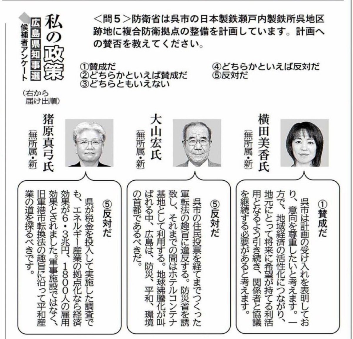 呉市の日鉄跡地への防衛省施設の誘致計画について県知事候補者の意見が載ってます。私は大賛成です。昨日の呉市長選挙候補者討論会でも出てたけど呉市の人口減の対策が見えてこないのが現状なのに(T . T) #呉