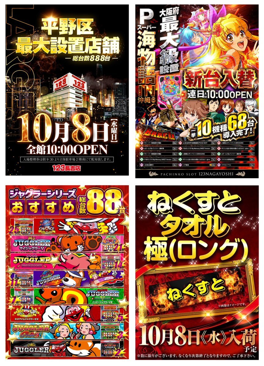 10/08 特攻すべき注目ホール⚔🛡️ . 大阪府大阪市平野区長吉出戸3丁目3番60号 123長吉 店 . →新台入替(2日目) →ねくすとタオル⇨極ロング🔥 . 長吉エリアを代表する店舗が、 『ねくすとタオル』入荷にて 店内を大きく盛り上げる🎁 . 今回は"極ロング"の入荷となり、 多台数構成/少数台構成 pic.x.com/3GZgZyUenh x.com/tokkou_kansai/…