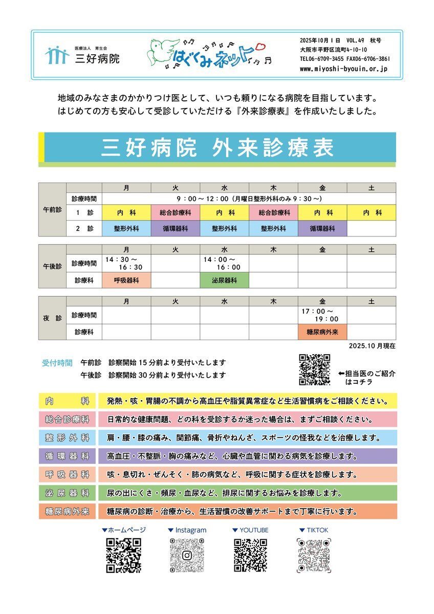 三好病院の広報誌 はぐくみネット2025年 10月号Vol.49です。 #三好病院 #はぐくみネット #リハビリ #平野区 #整形外科 #回復期リハ #回復期リハビリ #回復期リハビリテーション病棟 #回復期リハビリテーション pic.x.com/Oo0Y45zzEt